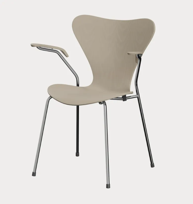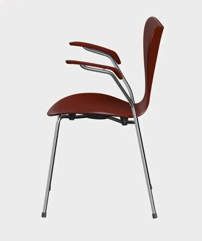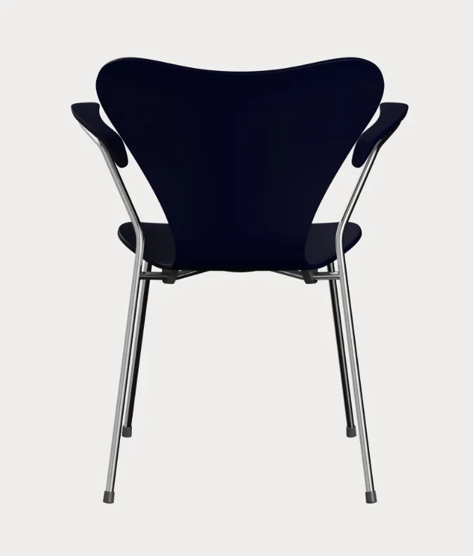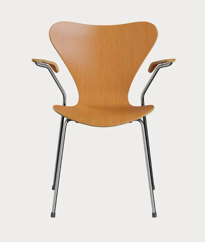 The original Series 7 chair is the 3207. It was launched in 1955 at the H55 international design exhibition in Sweden as Arne Jacobsen’s reply to the criticism he received for the Ant chair. The 3207 provided a striking response with perfectly proportioned armrests that follow the contours of the curved backrest while extending the smooth lines of the rear legs to create a perfectly balanced and supremely comfortable design.
