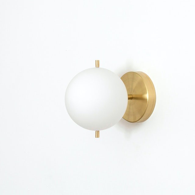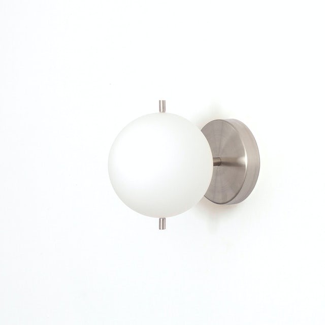 The SIGNAL SCONCE features a hand-blown glass globe suspended from a luminous metal back plate by a pair of metal pins. A sinuous pull chain is weighted by a slender bar, giving the piece a jewel-like presence. UL Listed. Damp Rated.