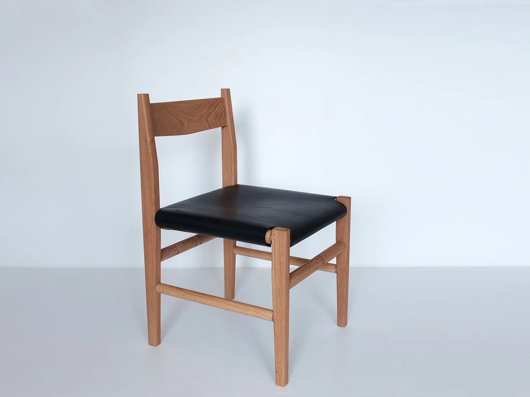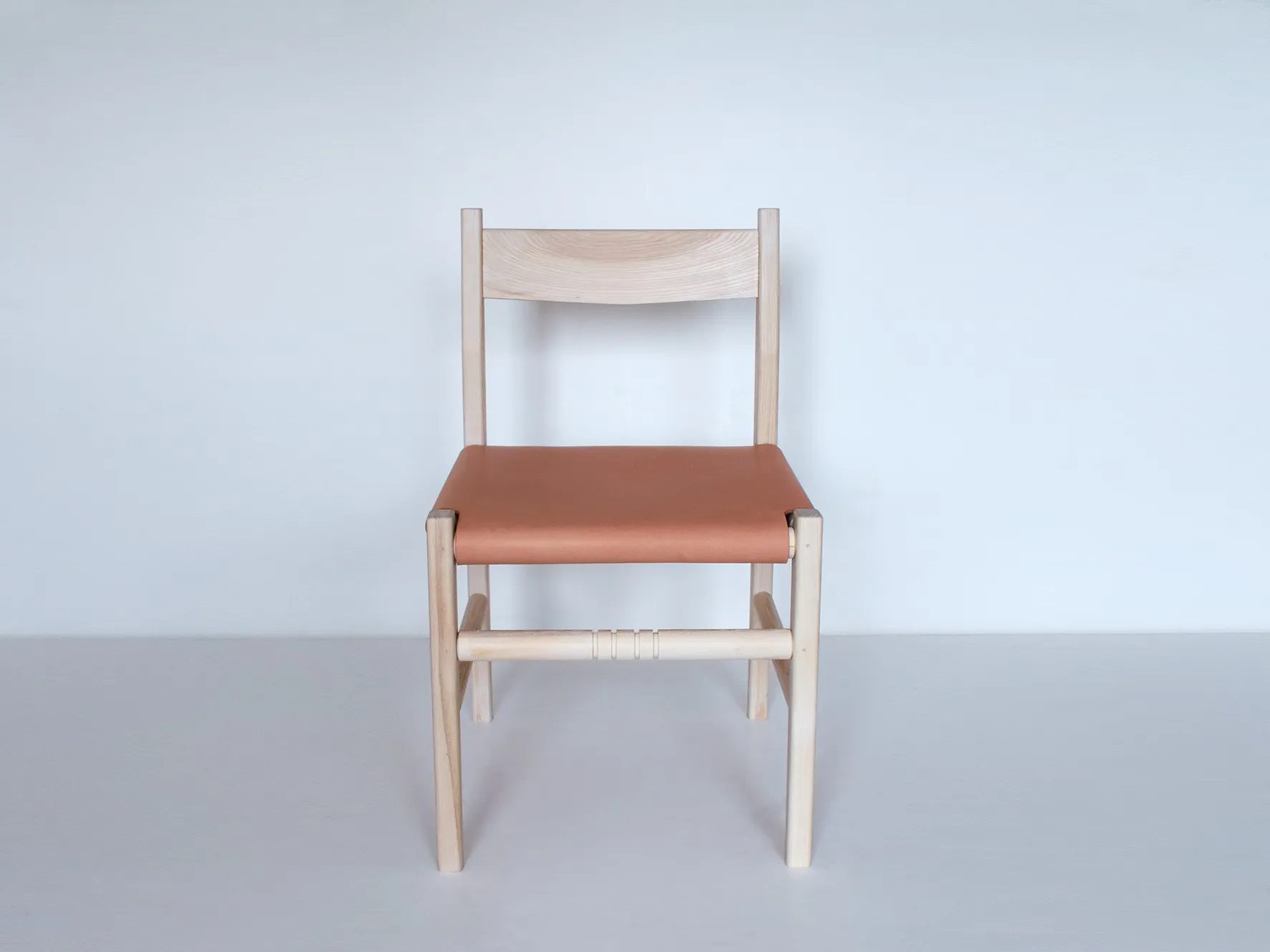The Silo Dining Chair is available with a woven Hickory Bark seat, a woven Shaker Tape seat, or a leather sling seat.