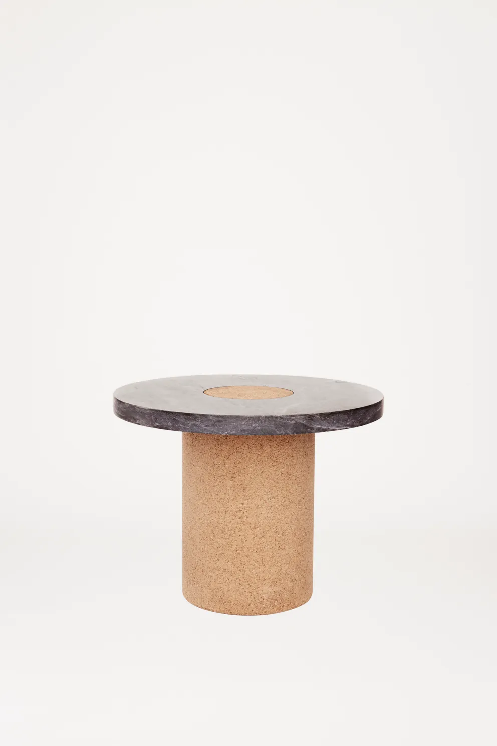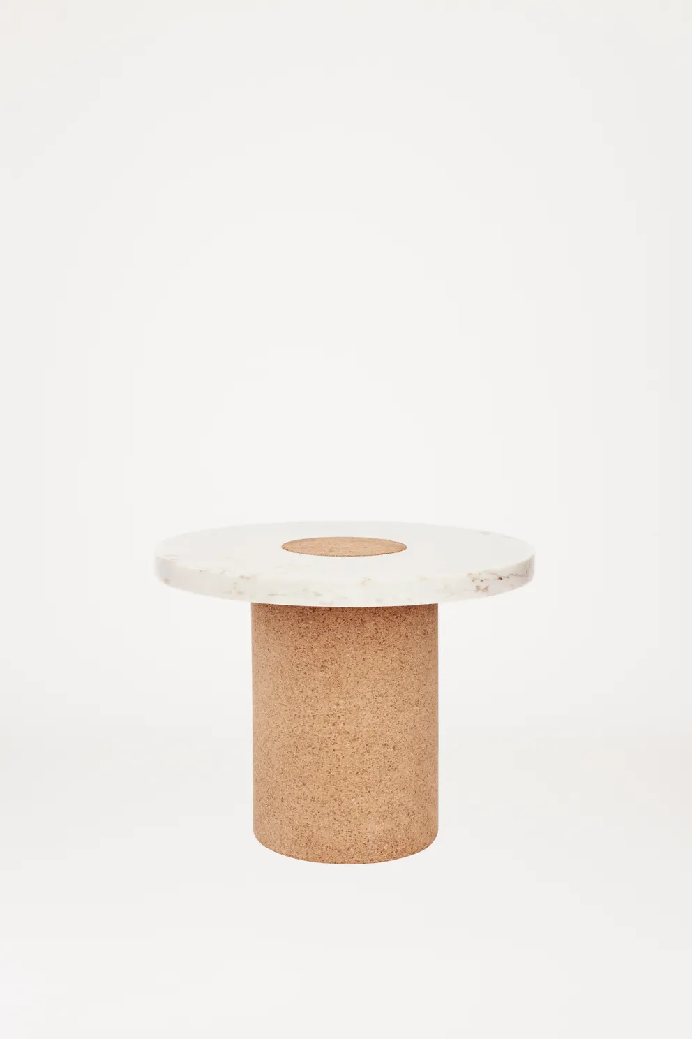 Suitable as a coffee table or side table where the contrast between the soft warm cork, meets the cold smooth marble. The distinction between the two shapes gives the impression of two worlds meeting one another.