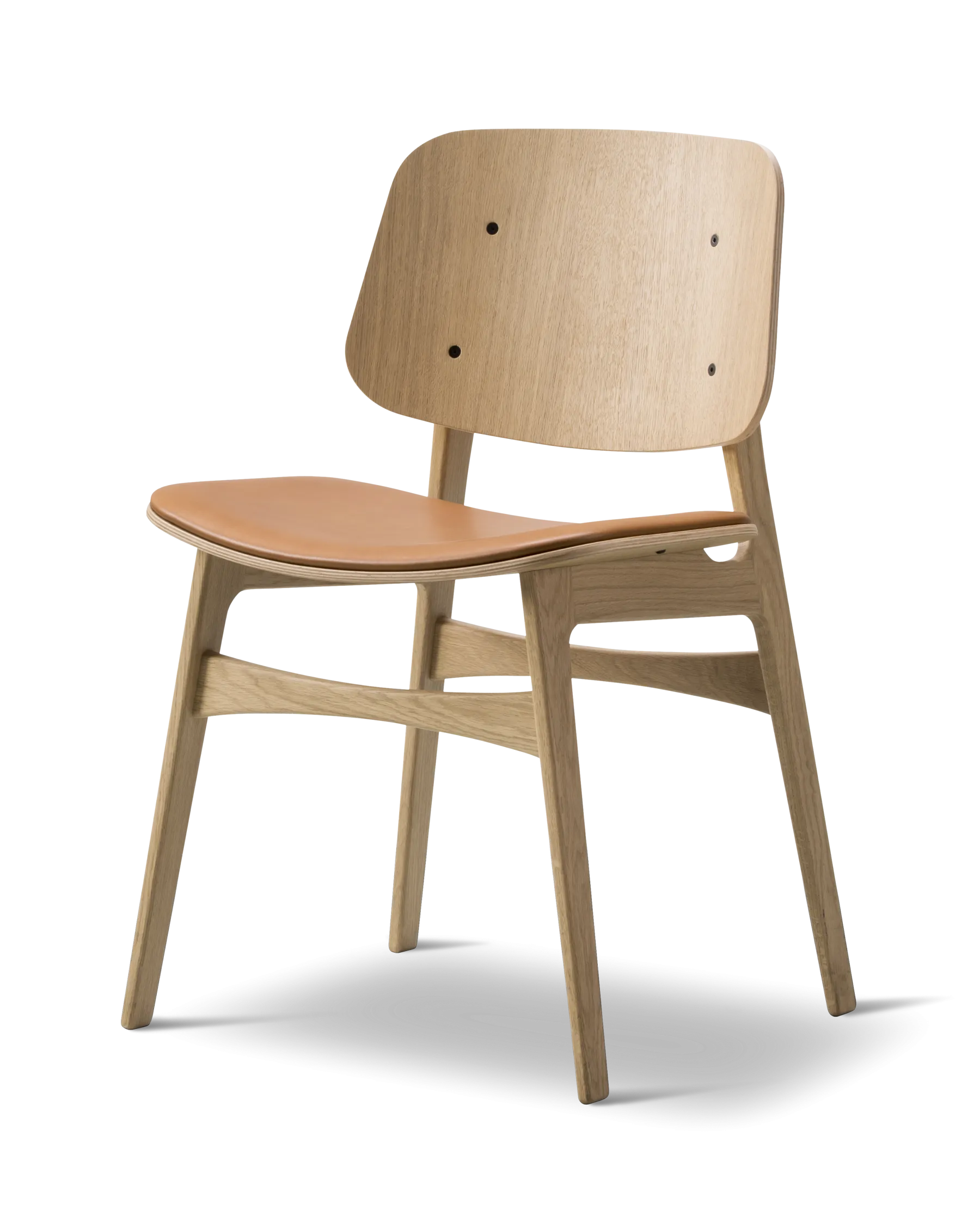 Mogensen presented the prototype for the Soborg chair in 1950. His intention was to fuse plywood shells with his signature solid wood functionalism. The generous back and seat with optional upholstery provides for many hours of use.