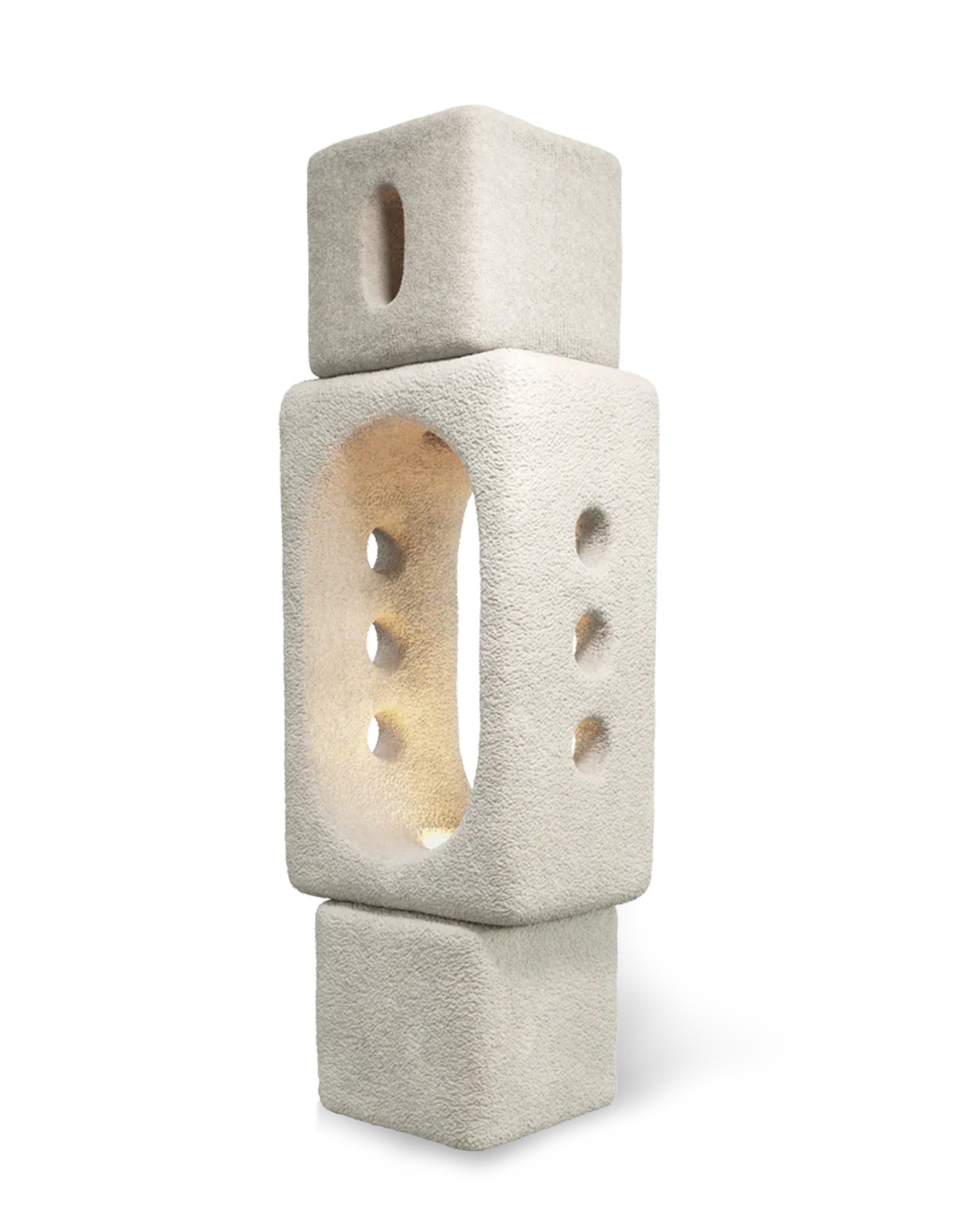 A smaller version of the Souvenir Floor Lamp. Made with traditional East Asian techniques of binding reed and paper over a form. The Souvenir Lamps explore the concept of spiritual gateways and how they symbolically mark a transition from the mundane to the sacred. Simple, pared down lines in the architecture help to elevate the paper illumination and create a central visual beacon.