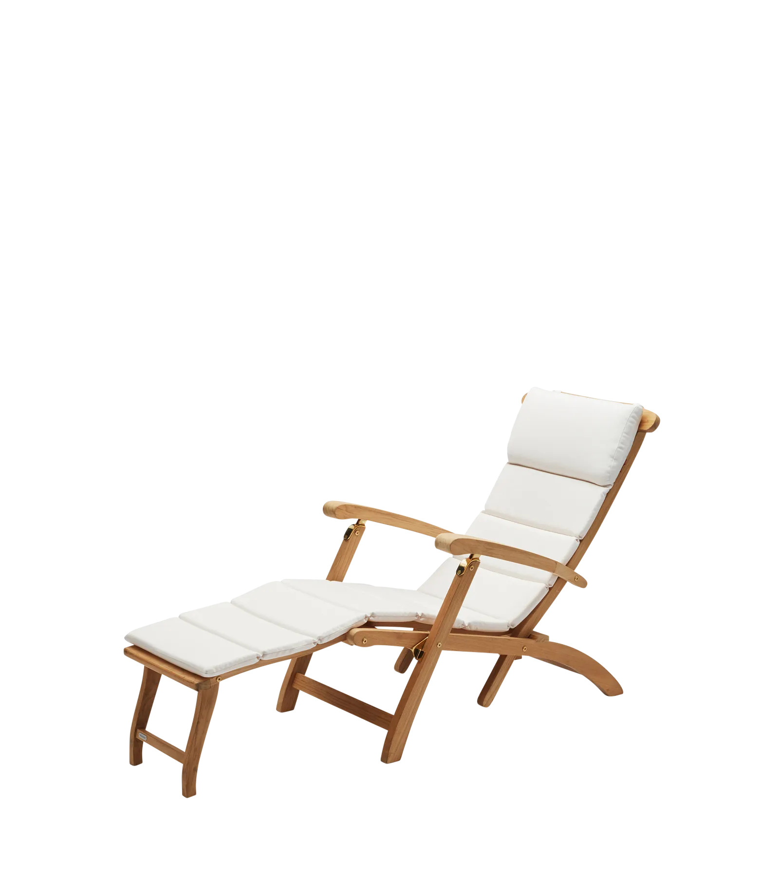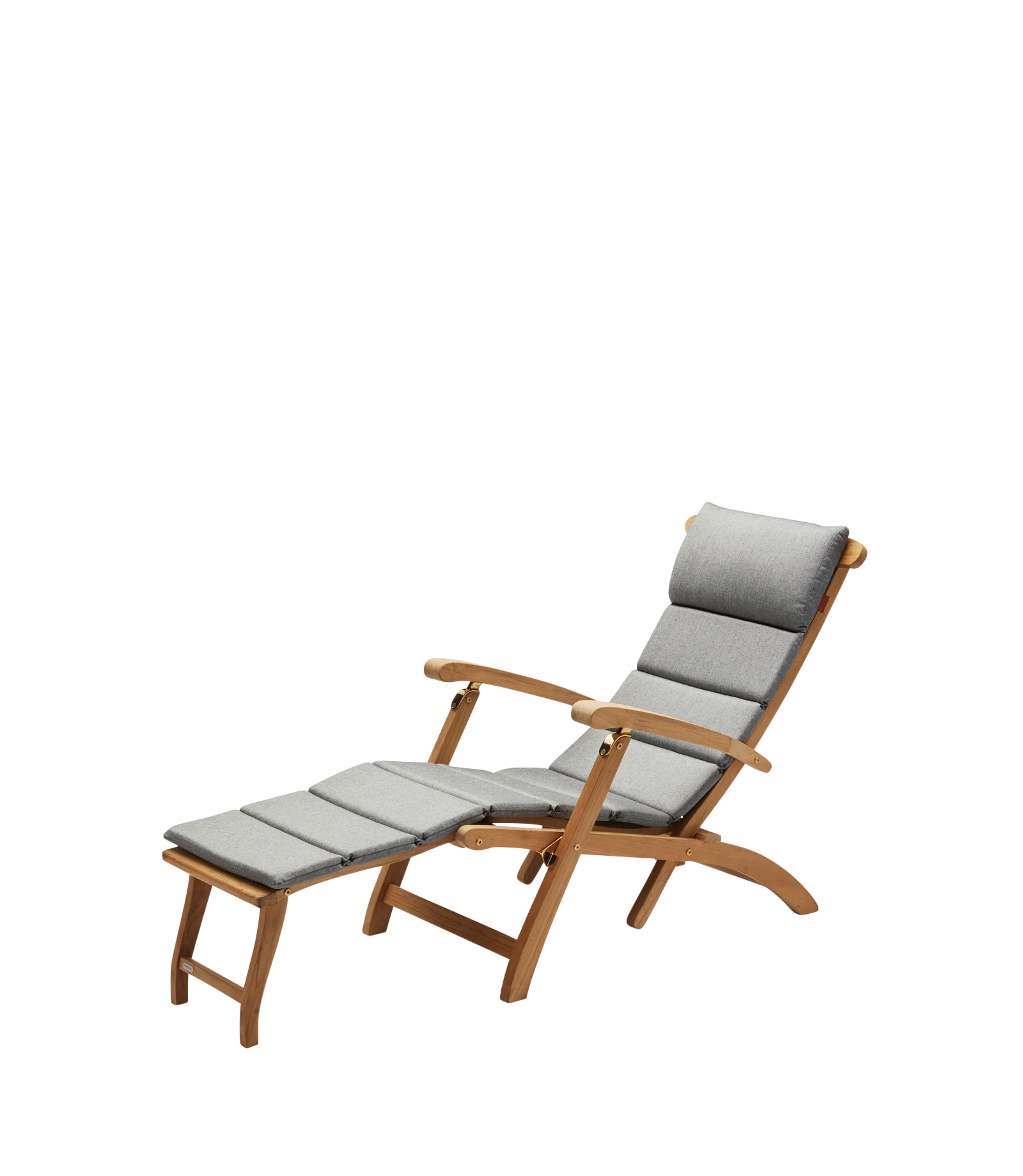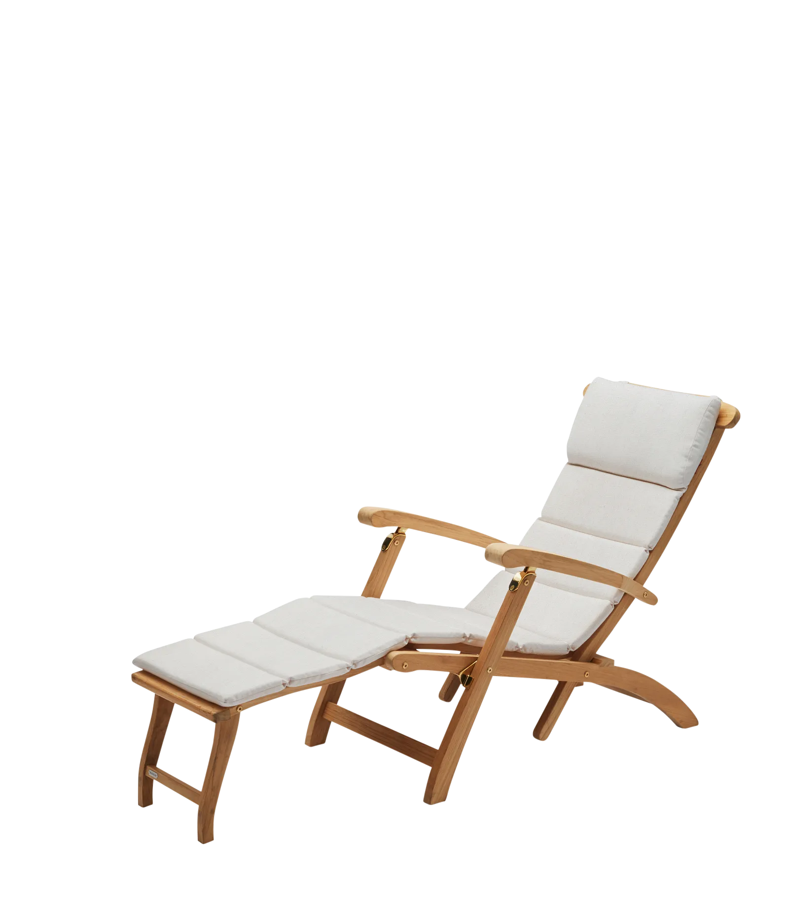 Deck Chair Cushion is custom-made for the wooden Steamer Deck Chair. The top is designed with an inserted height and two velcro straps, keeping the cushion in place. Able to withstand wind and weather, the upholstery textiles are Oeko-Tex® certified and extremely colour and lightfast as well as water and dirt-repellent and even mildew-resistant. The cushion dries exceptionally quickly, even after a heavy downpour, as the foam has an open-cell structure that allows both water and air to pass through. The foam provides a firm and comfortable texture that remains the same year after year.