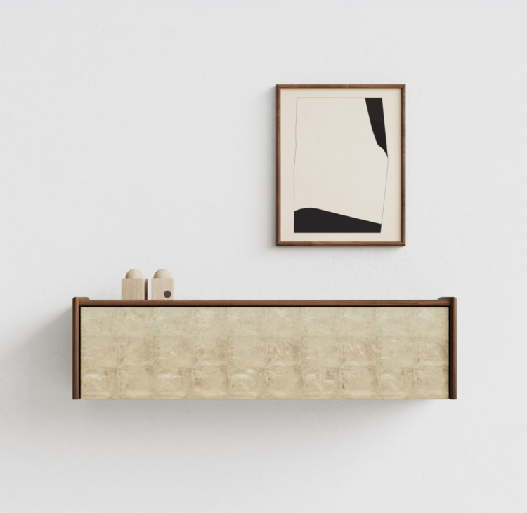 A wall hanging drawer. An integral part of the Profile Series with either a wood or a hand gilded drawer front. Gilded in authentic 16 karat pale gold leaf.