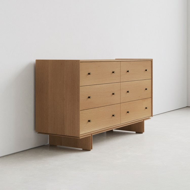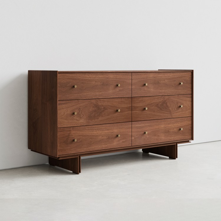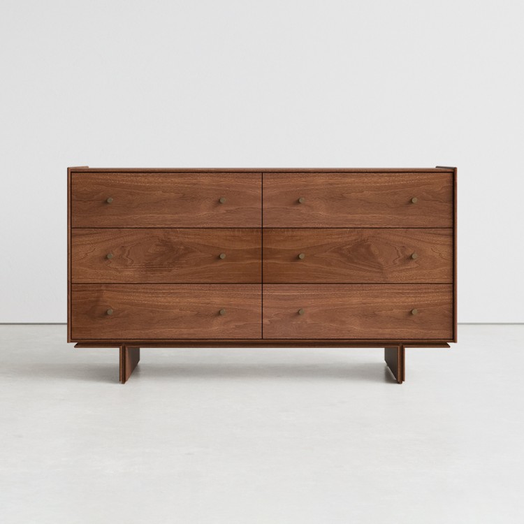 The Profile Dresser in an integral part of the Profile Series. A case constructed of solid wood with dovetailed maple drawers. Hand-turned patinaed brass pulls.