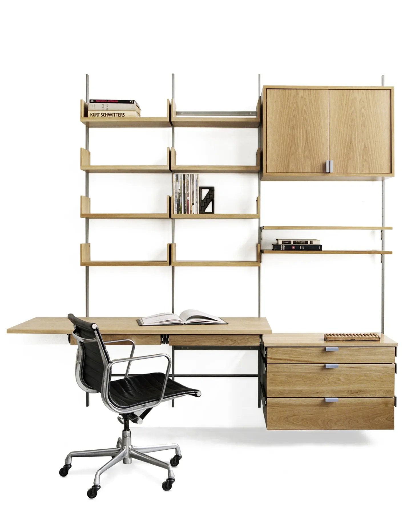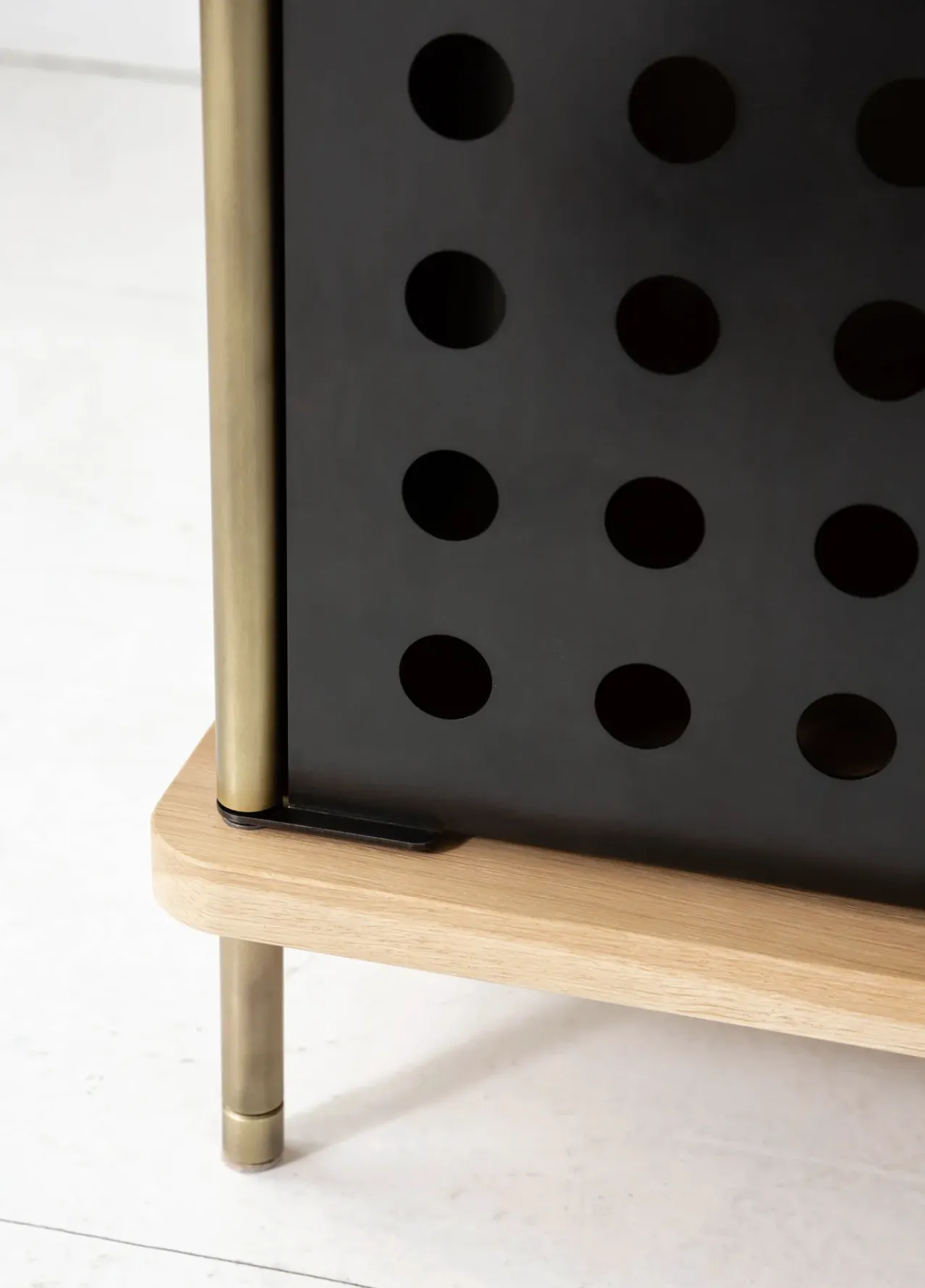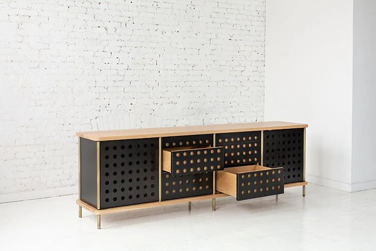 Strata is an elevated synthesis of materials at its most elemental. Hardwood surfaces are joined by vertical steel rods to create a rigid architectural framework. External rods celebrate the unique construction, while brake-formed steel panels form a captive interior. Extensive standard finish options available for the wood, rods and panels create a myriad of possible combinations ensuring each made-to-order piece compliments its space perfectly.