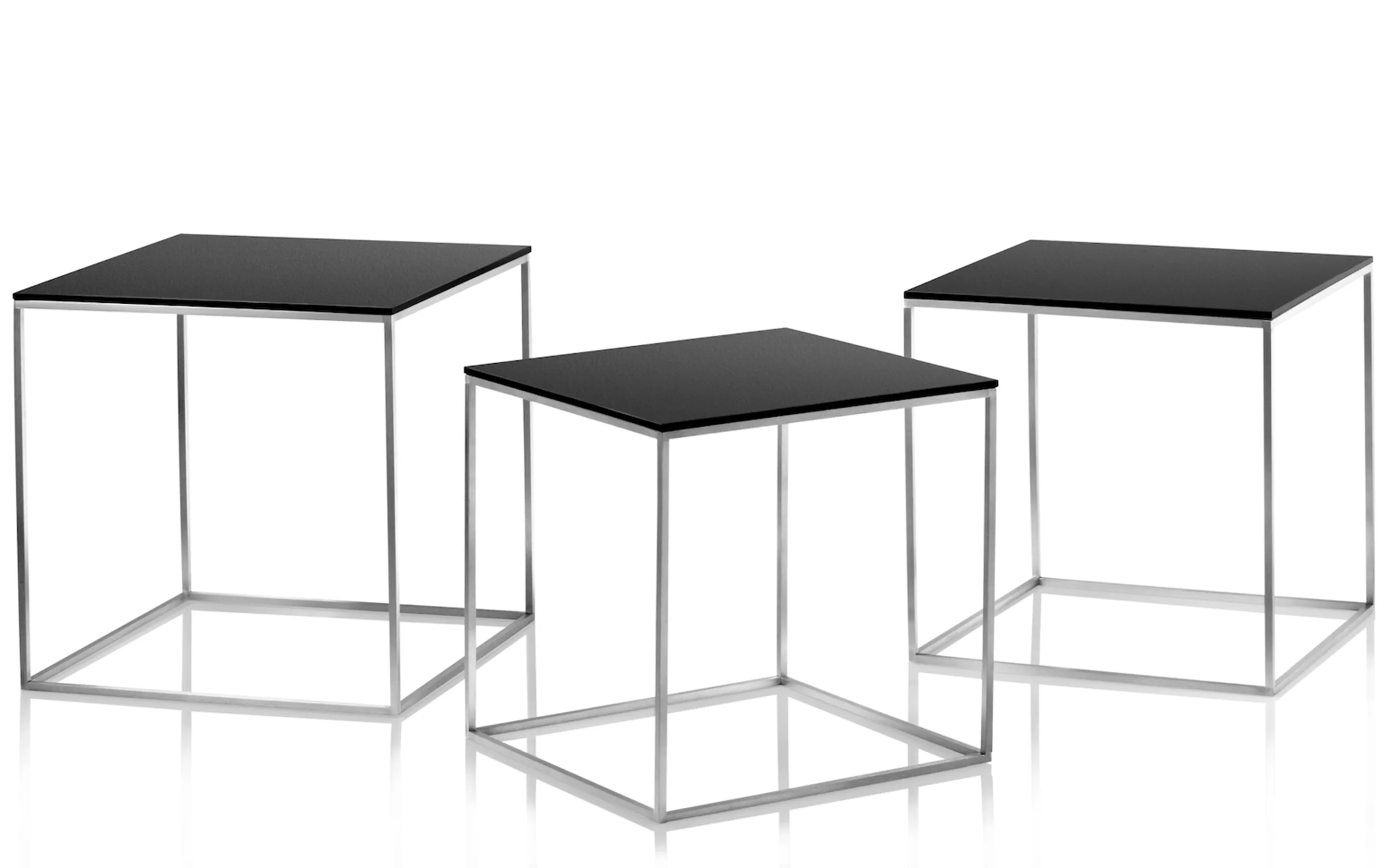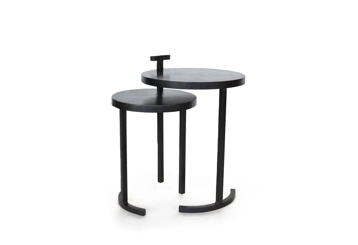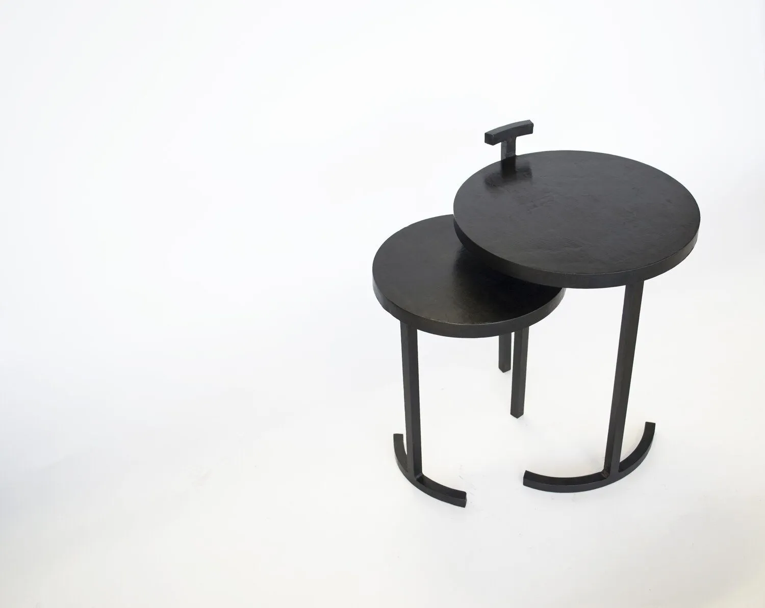 Composed of two separate side tables—with each table only having two legs! This nesting side table is made from cast, blackened, and waxed steel. This uniquely designed frame allows for a 1-inch thick, cast steel, circular top to balance on only two legs. This is the first table designed by J.M. Szymanski, and it is a favorite among collectors, designers, and architects alike. Made in The Bronx, New York, USA.