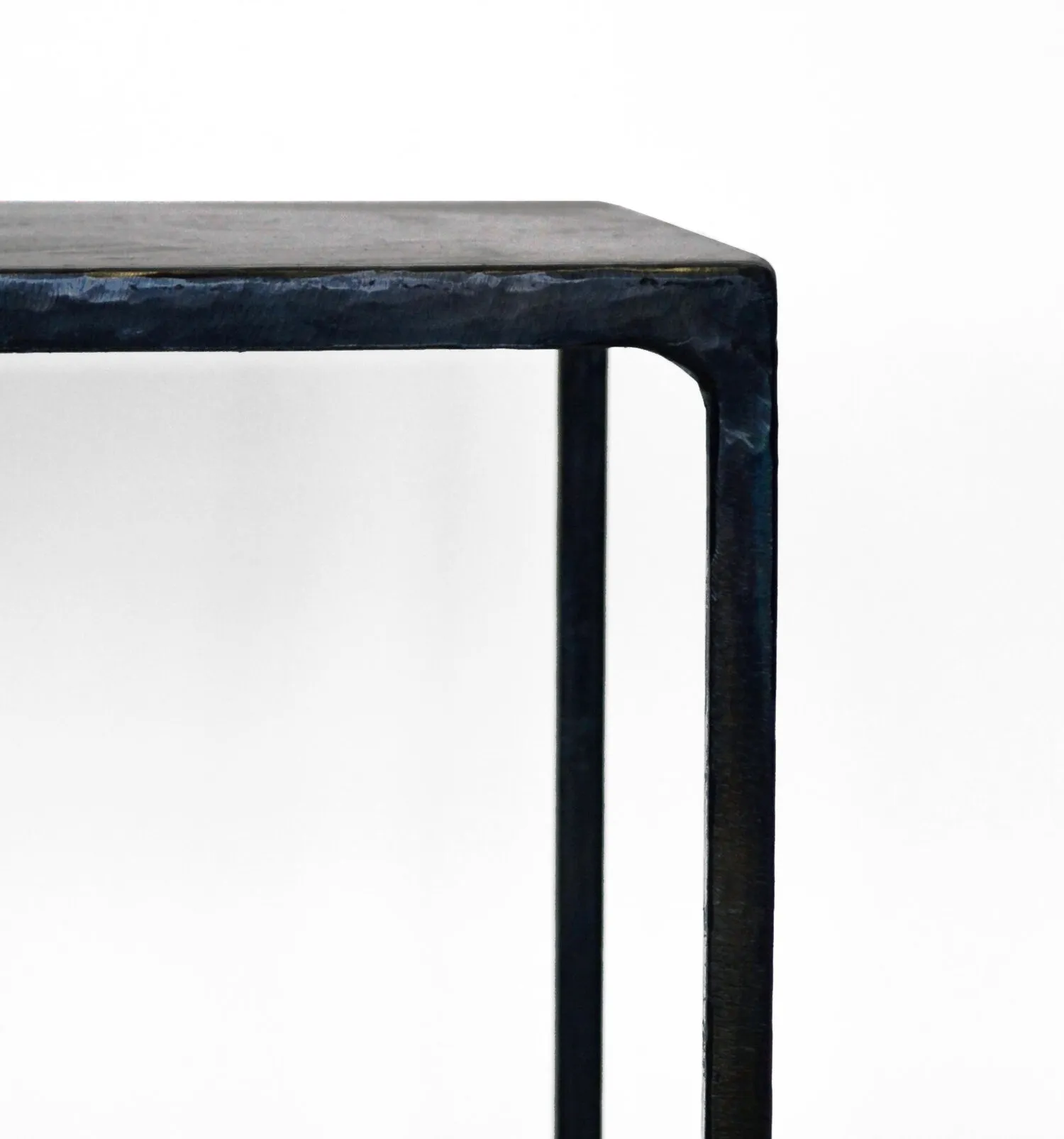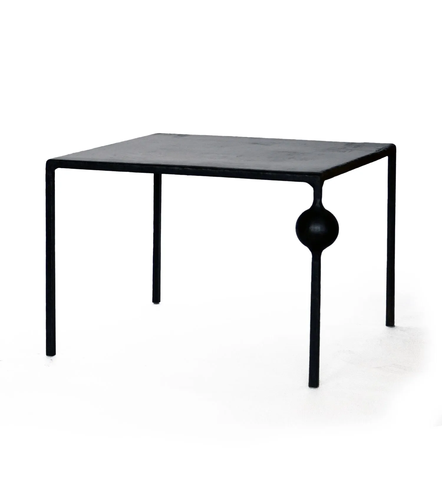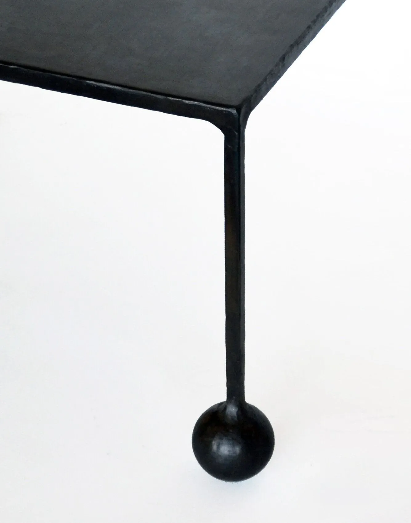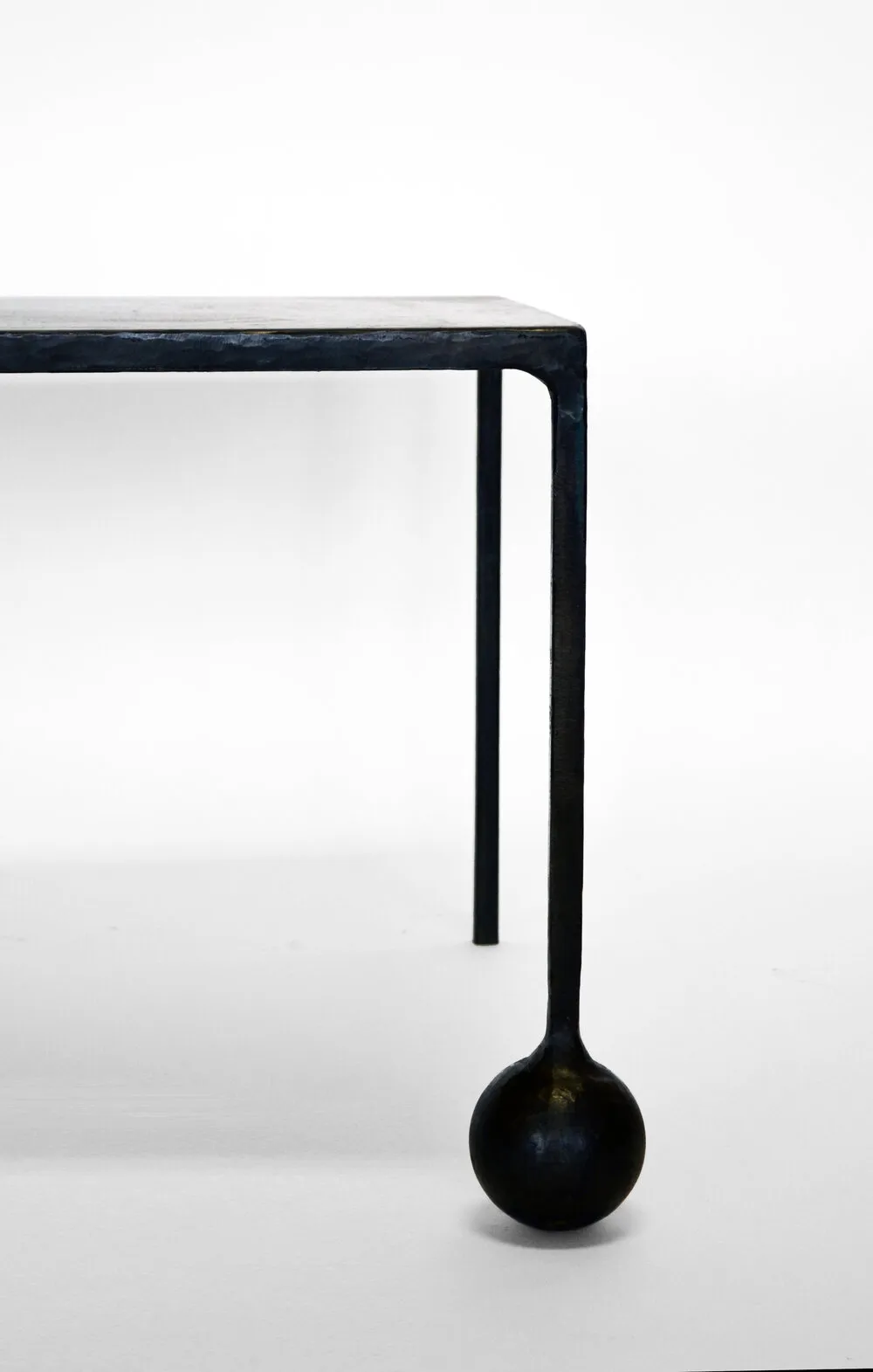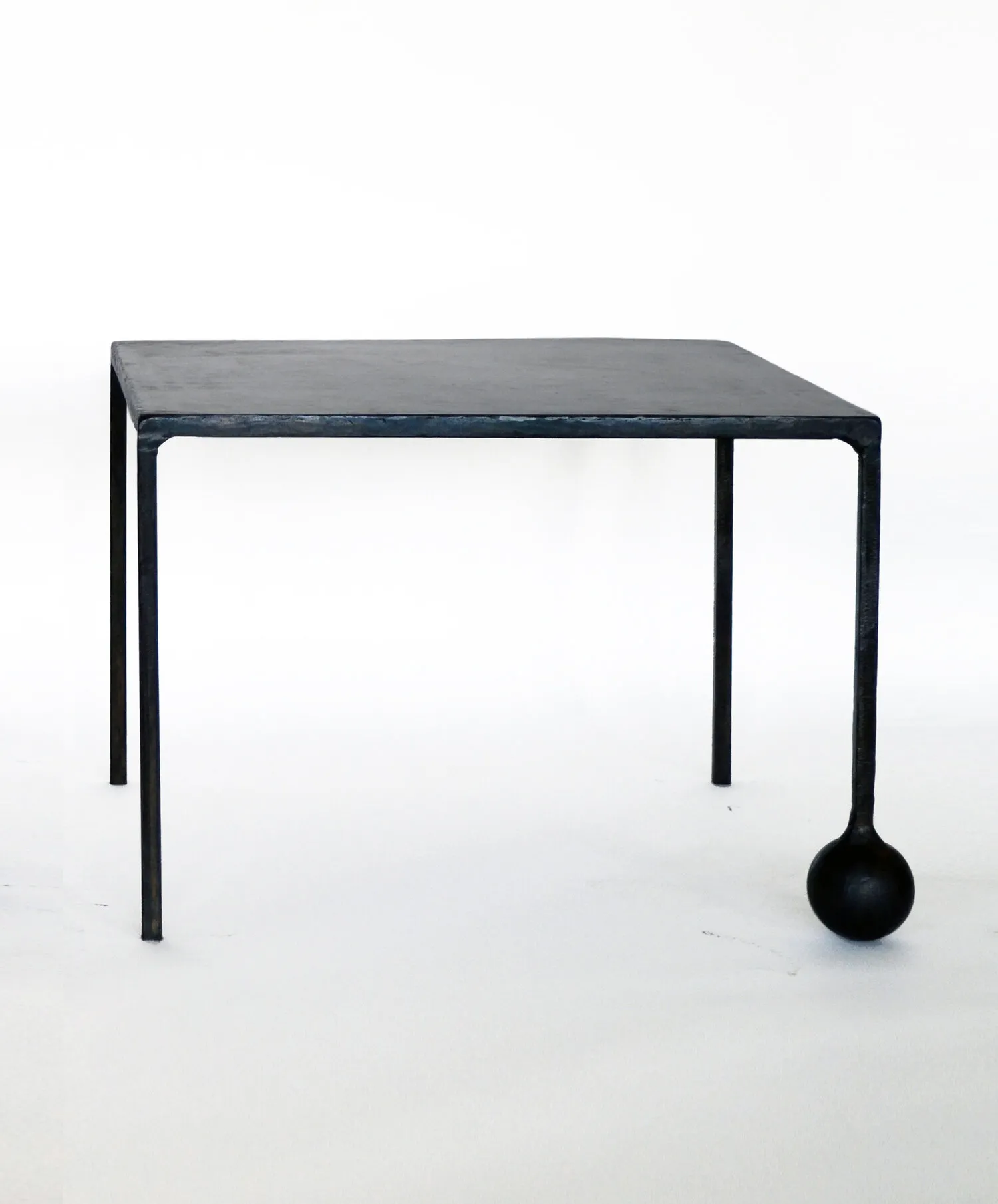 This geometric, solid, steel structure is supported by a cast-sphere base. The refined simplicity of this design speaks volumes, and adds depth and elegance to any space. Made in The Bronx, New York, USA.