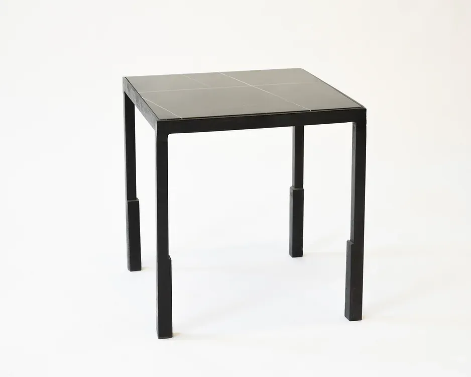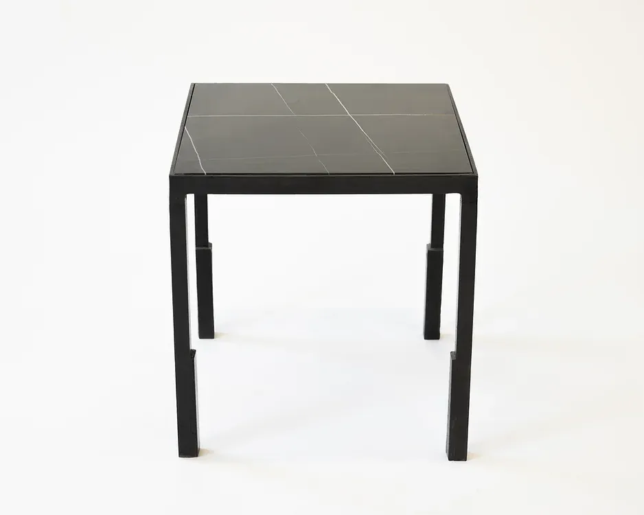 A handsome silhouette featured on a carved steel frame. You may choose from a seamless craved steel surface or an inset marble top. Made in the Bronx, New York, USA.