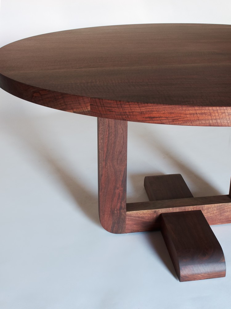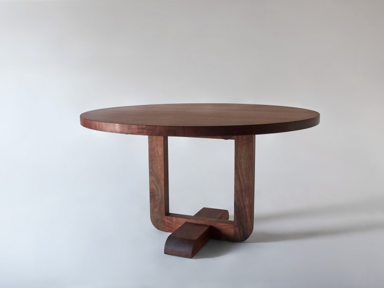 - The Alpen Round Dining Table features a solid wood top, and laminated sculptural base. Equally at home as a dramatic entryway table.