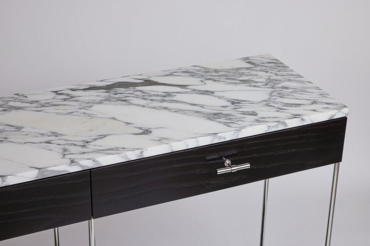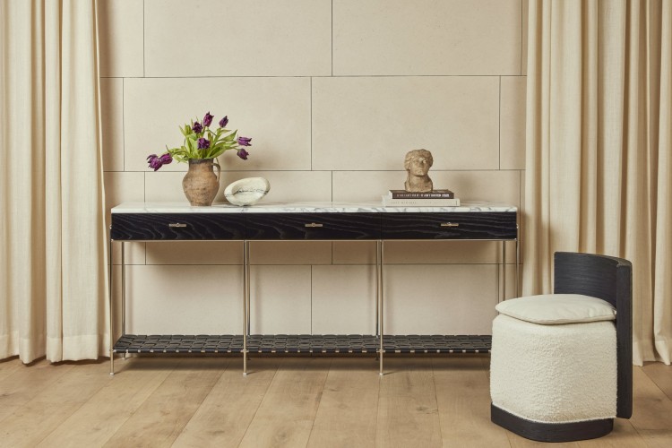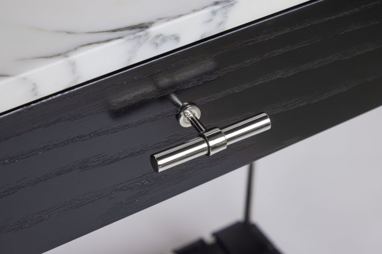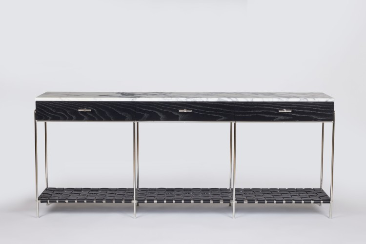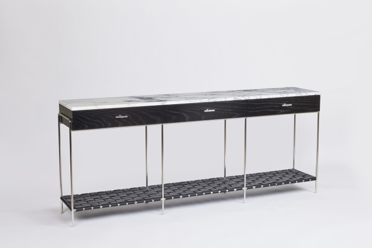 Black Stained Oak Console with Marble Top and Woven Leather Shelf