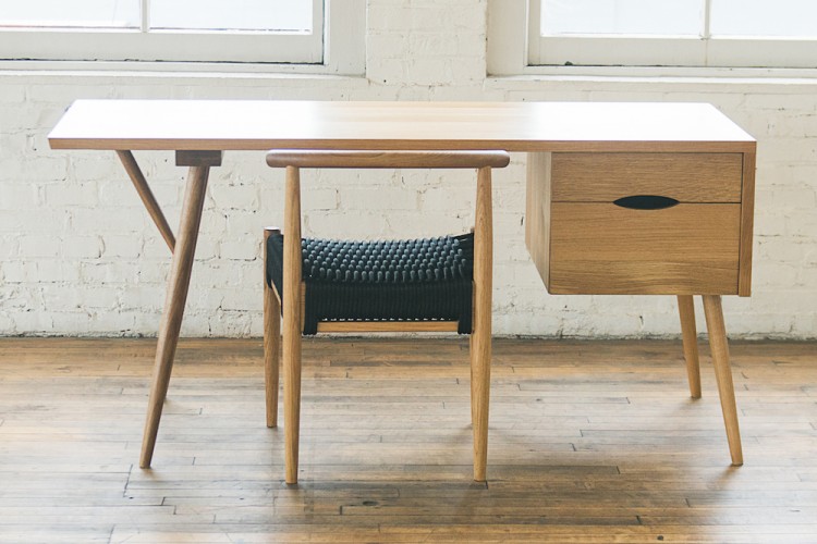 The Emmett Desk is a simple asymmetrical desk with exposed offset box joints and turned tapered legs. Spread your papers out, pile your books in a corner, open the laptop, draw for hours, put your feet up, hold yourself steady against the workday or creative night. The desk has two drawers that share an oval hole shaped pull. The Shaker legs under the cantilevered end are also found on our Bainbridge Family Table. Available in the two sizes shown here as well as custom sizes or configurations to fit your space.