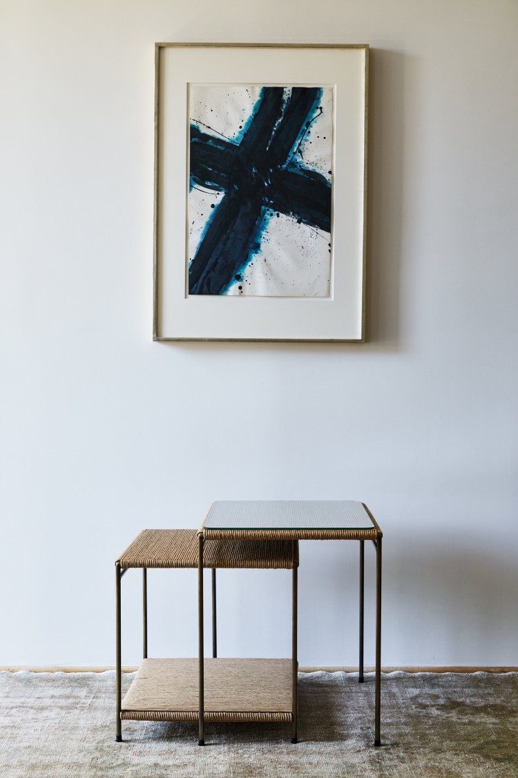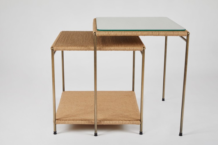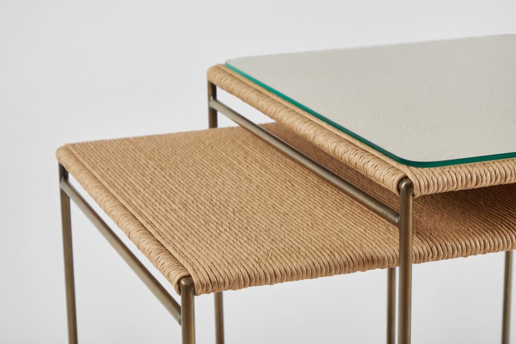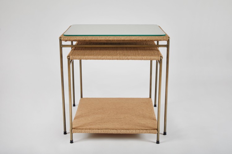 Large Single Rail Handwoven Rush Nesting Table with Shelf - Bronze Plated