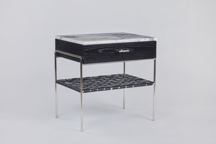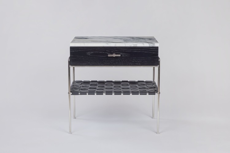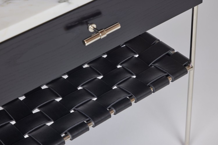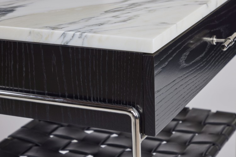 Marble and Stained Oak Side Table with drawer and woven leather shelf - Polished Nickel Plated