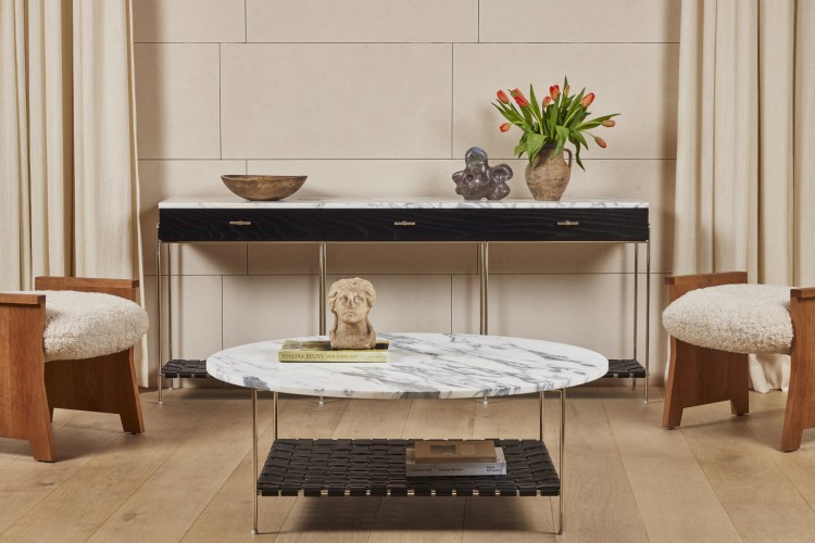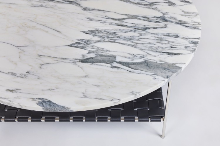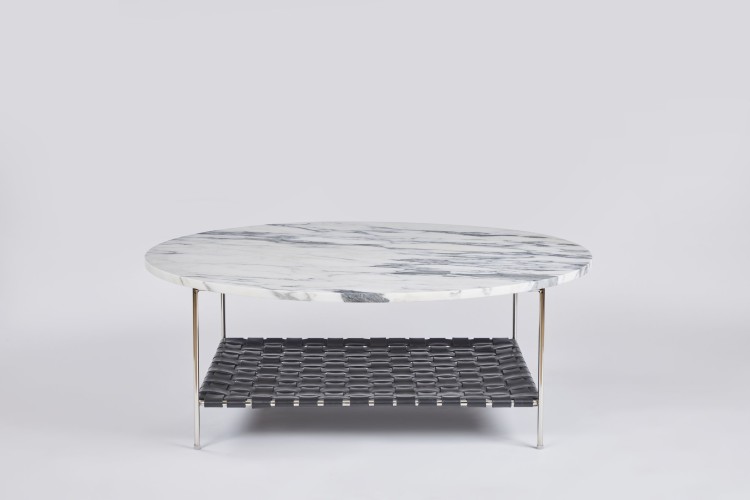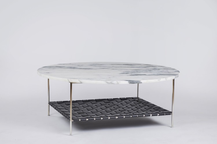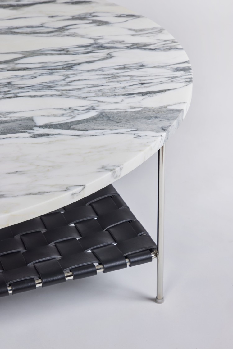 Marble Coffee Table with woven leather shelf - Polished Nickel Plated