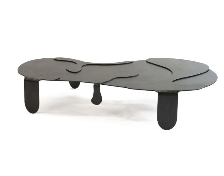 An abstract form moves organically through this unique work of art. The form ends in legs that “drip” to the floor. Solid 3/8” thick steel is layered to create a dynamic statement. Is this a table or sculpture?