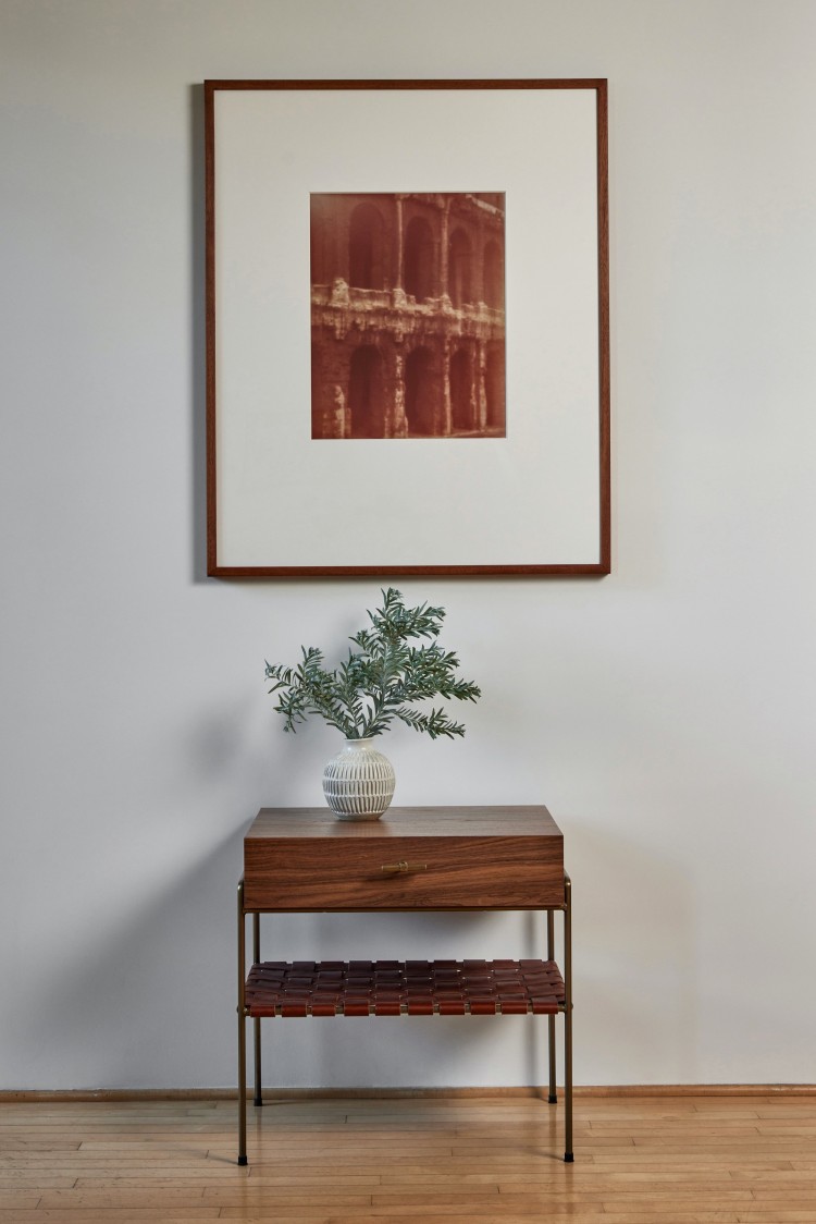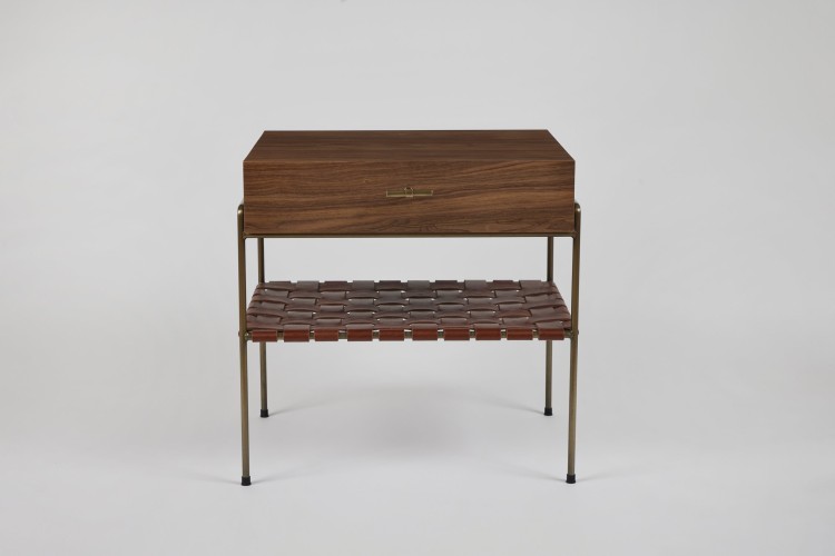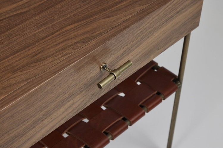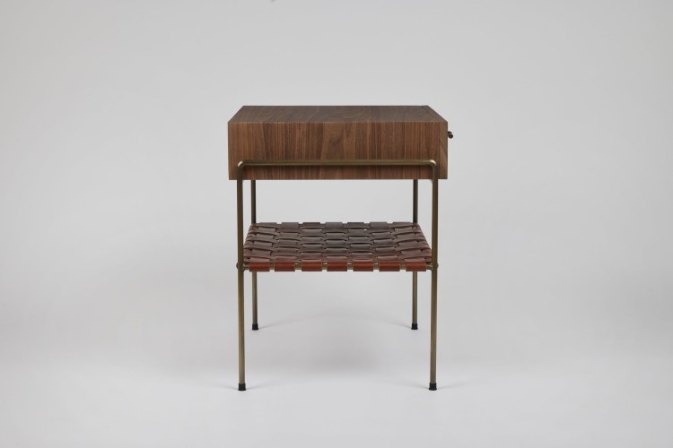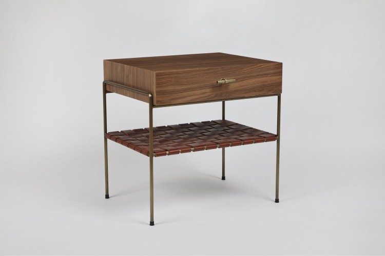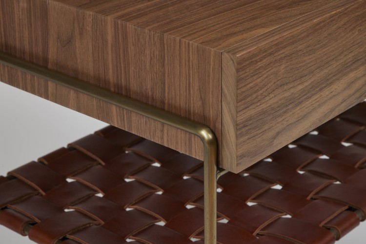 Walnut and Woven Leather Bedside Table with drawer - Bronze Blated
