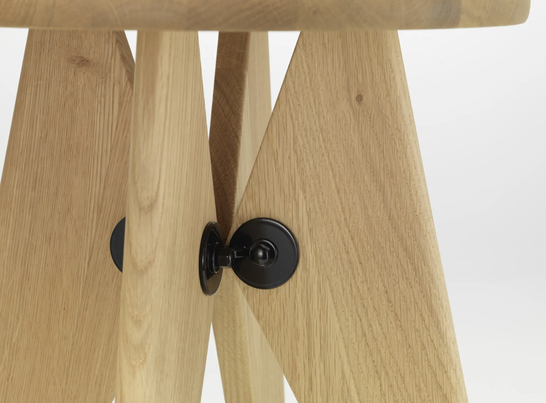 The classic Tabouret Haut bar stool by Jean Prouvé is available in robust solid oak, with a natural or dark stained finish. The chrome-plated steel ring with an anti-skid surface guarantees stability and offers comfortable use as a footrest.