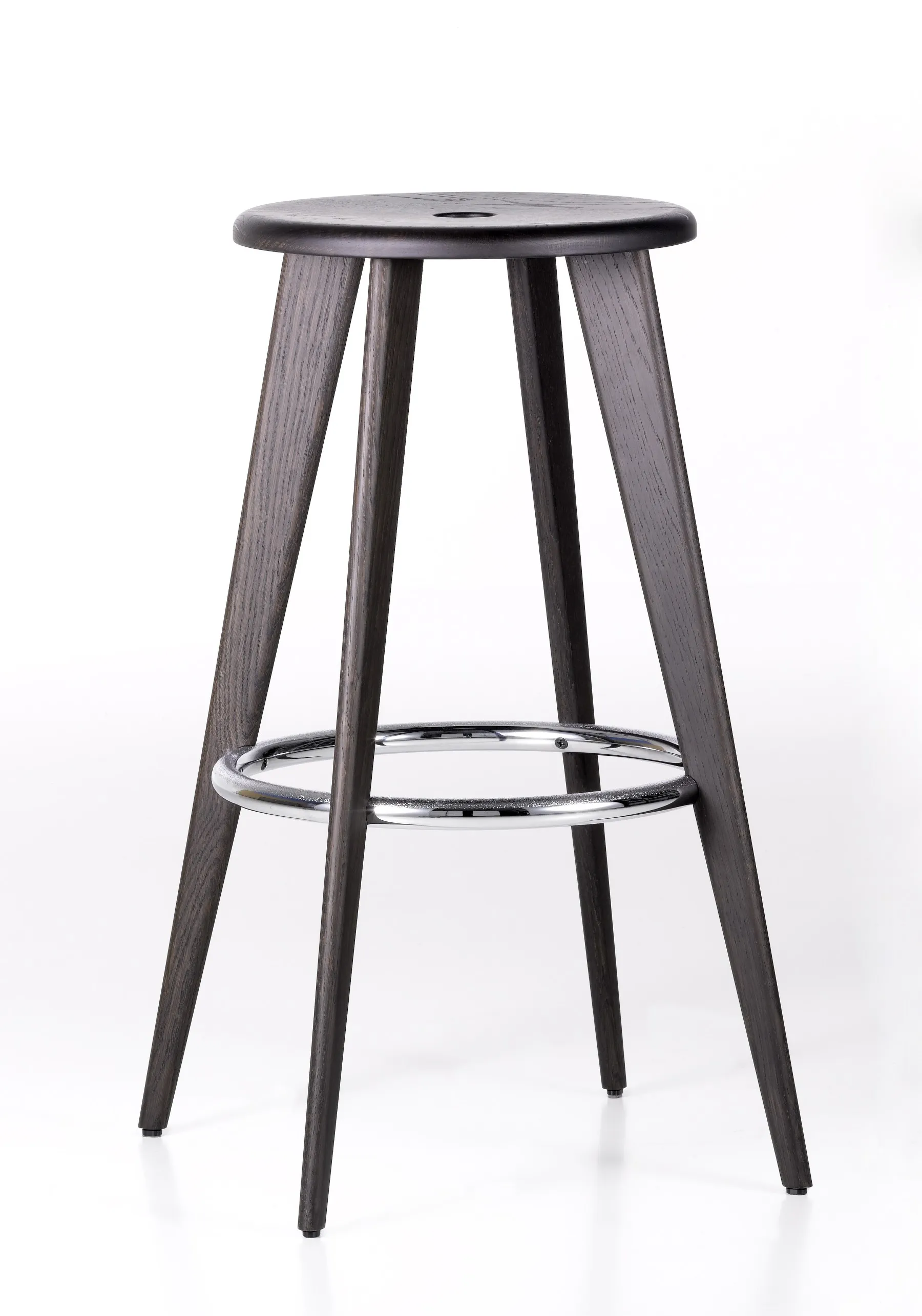 The classic Tabouret Haut bar stool by Jean Prouvé is available in robust solid oak, with a natural or dark stained finish. The chrome-plated steel ring with an anti-skid surface guarantees stability and offers comfortable use as a footrest.