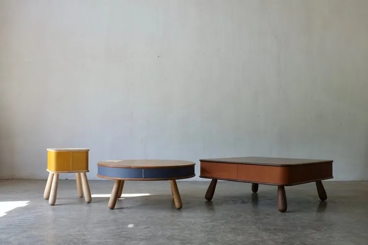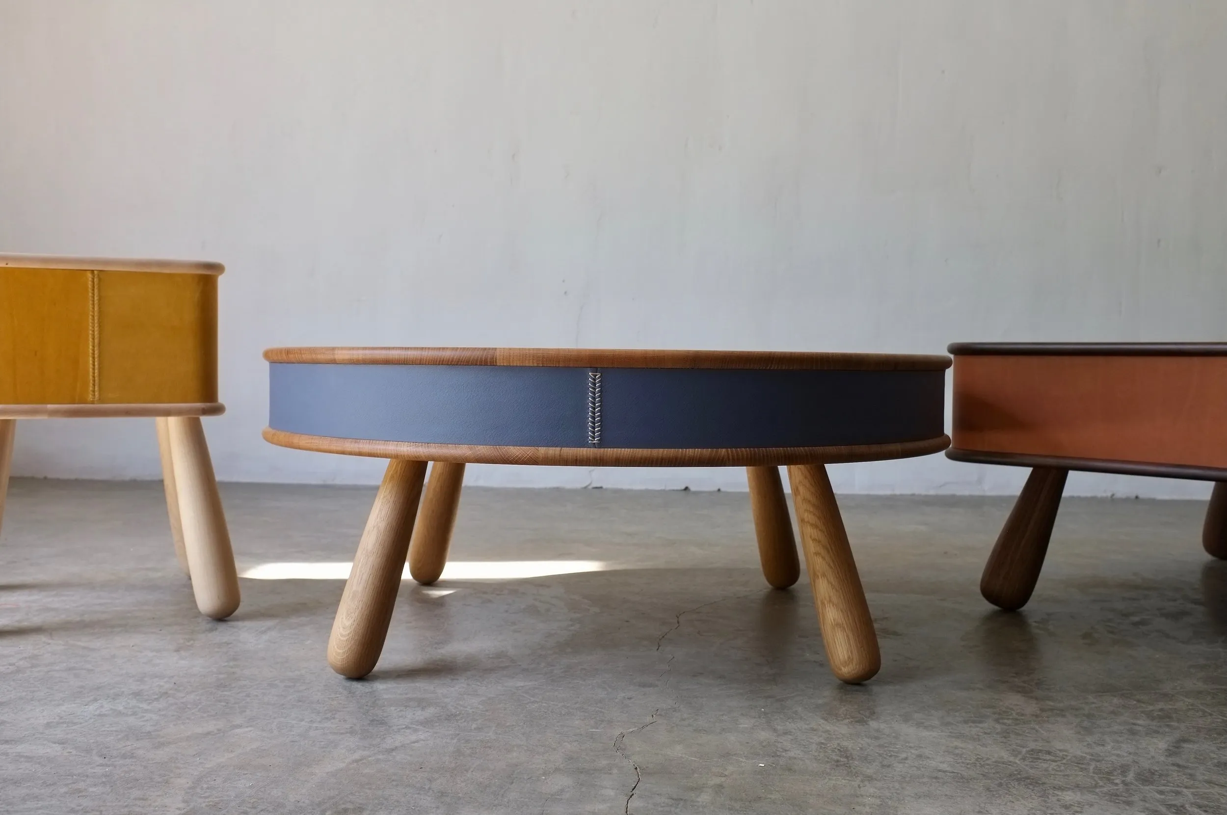 The Terrapin coffee table features solid wood construction with a hand stitched band of leather around its belly. A custom fitted drawer is available upon request.