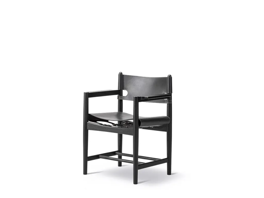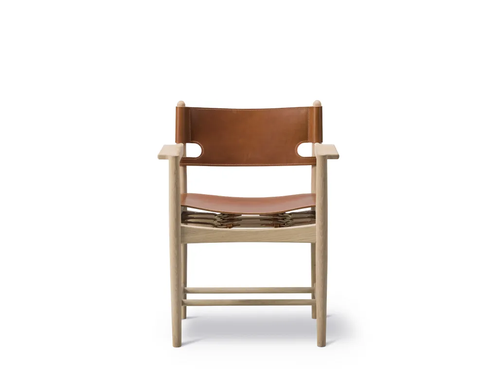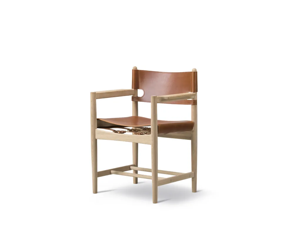 The armchair version of the Spanish Dining Chair brings Borge Mogensen's timeless design to the dining room. It is a testament to the application of honest materials. Crafted from the finest selection of oak and flawless saddle leather, the chair is available with or without armrests, and with multiple finishes from light to darker shades, depending on the atmosphere you want to create.