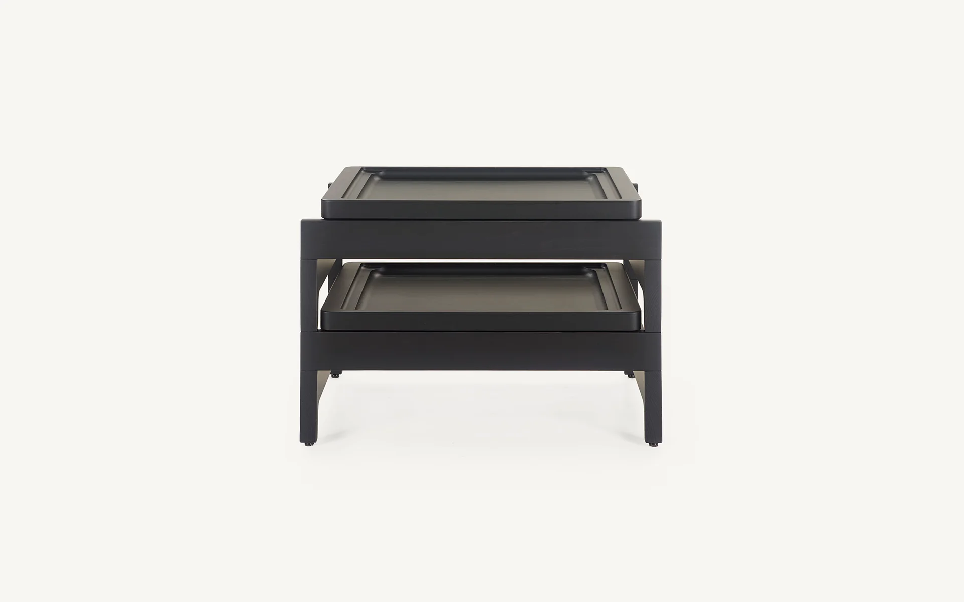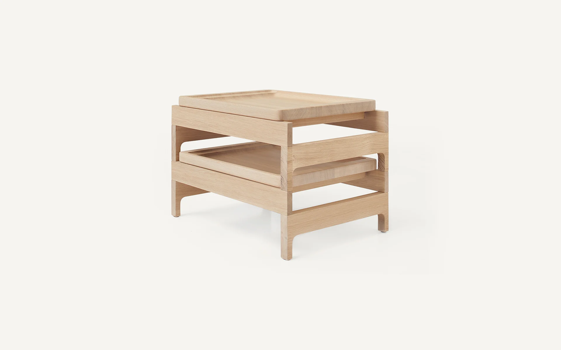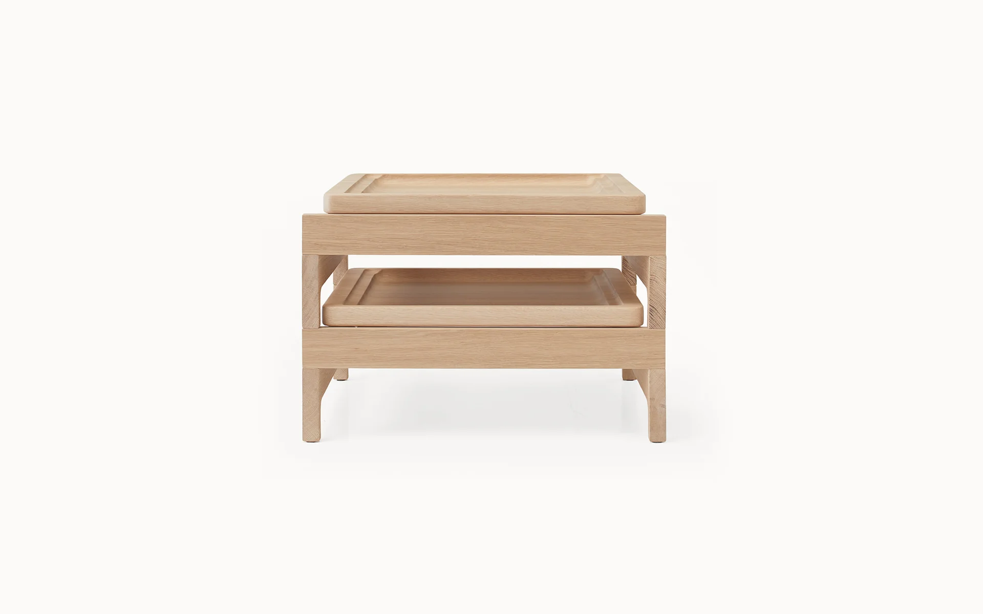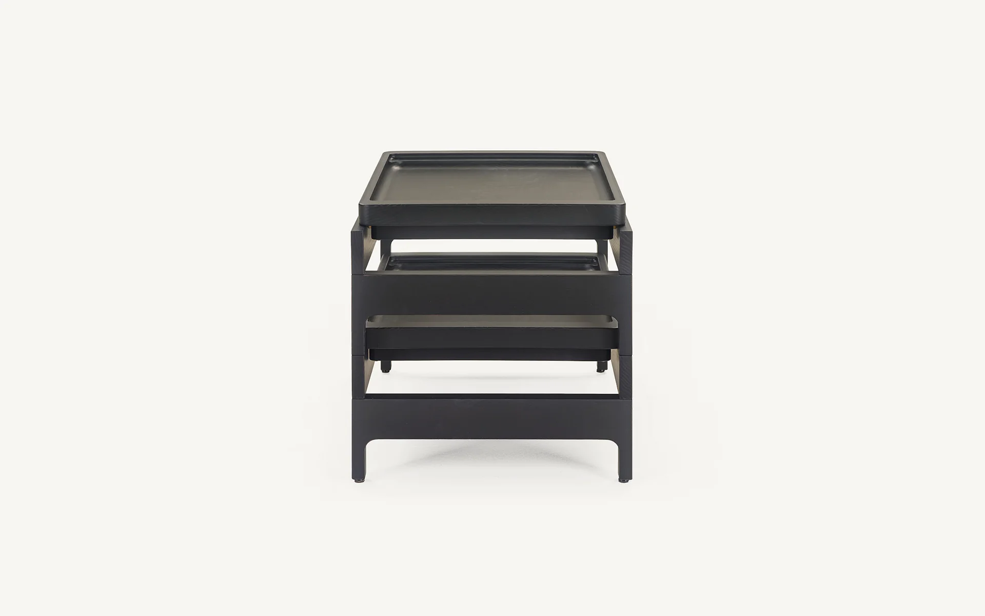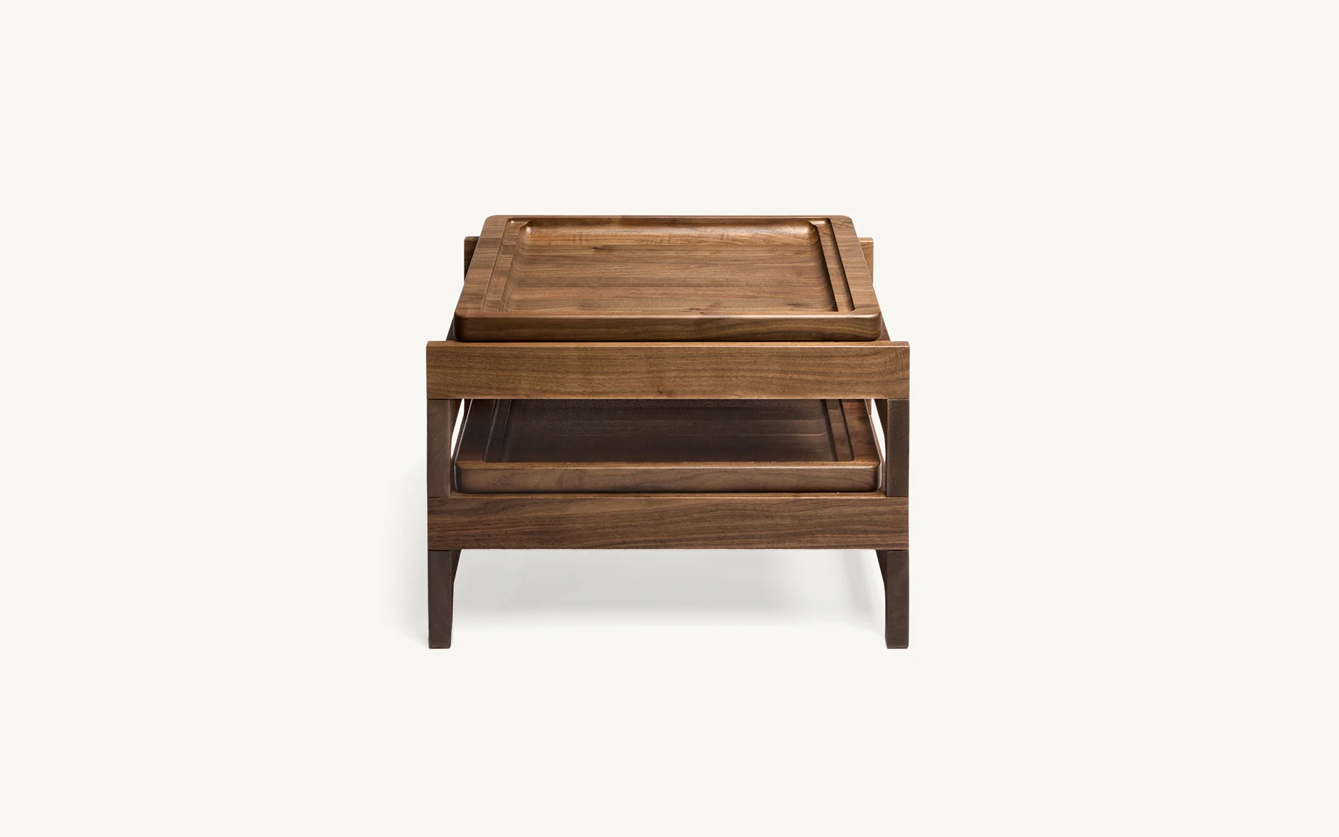 The idea of modularity is at the heart of the innovative BassamFellows Tray Rack Side Table, conceived in the spirit of luxurious contemporary living. The table provides a supremely simple and functional end table. Like other pieces in the collection, the Tray Rack utilizes the Stacking Tray as a basic building block. The Tray Rack is honestly constructed using alternating sections of solid wood that are layered and stacked to support the carved Stacking Trays. Solid brass ‘runners’ allow the trays to slide out for easy access. The effect is a piece that looks immaculately tailored. This is the kind of piece that is always useful and never out of place. The modular Tray Rack system is highly adaptable to different living or commercial environments. The Tray Rack table is suitable for any use where an end table is required. From bedside to the executive office, the removable trays are perfect for serving or entertaining.