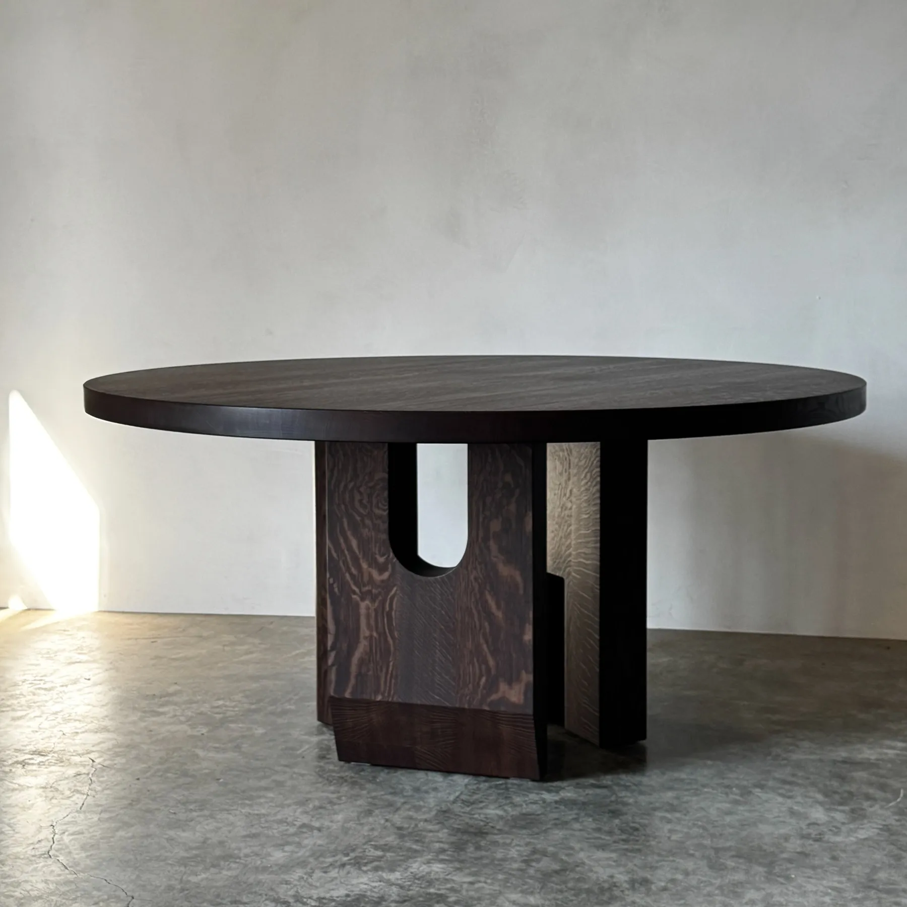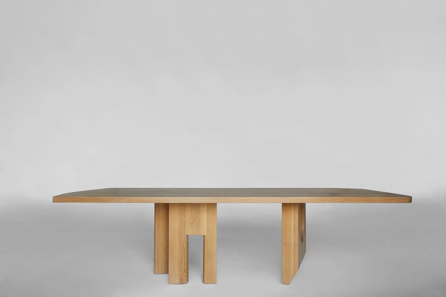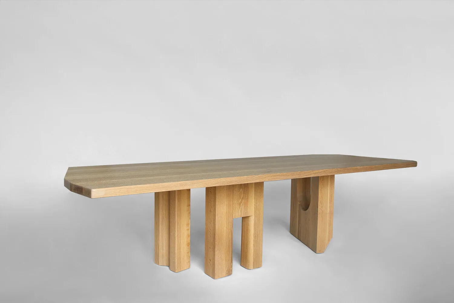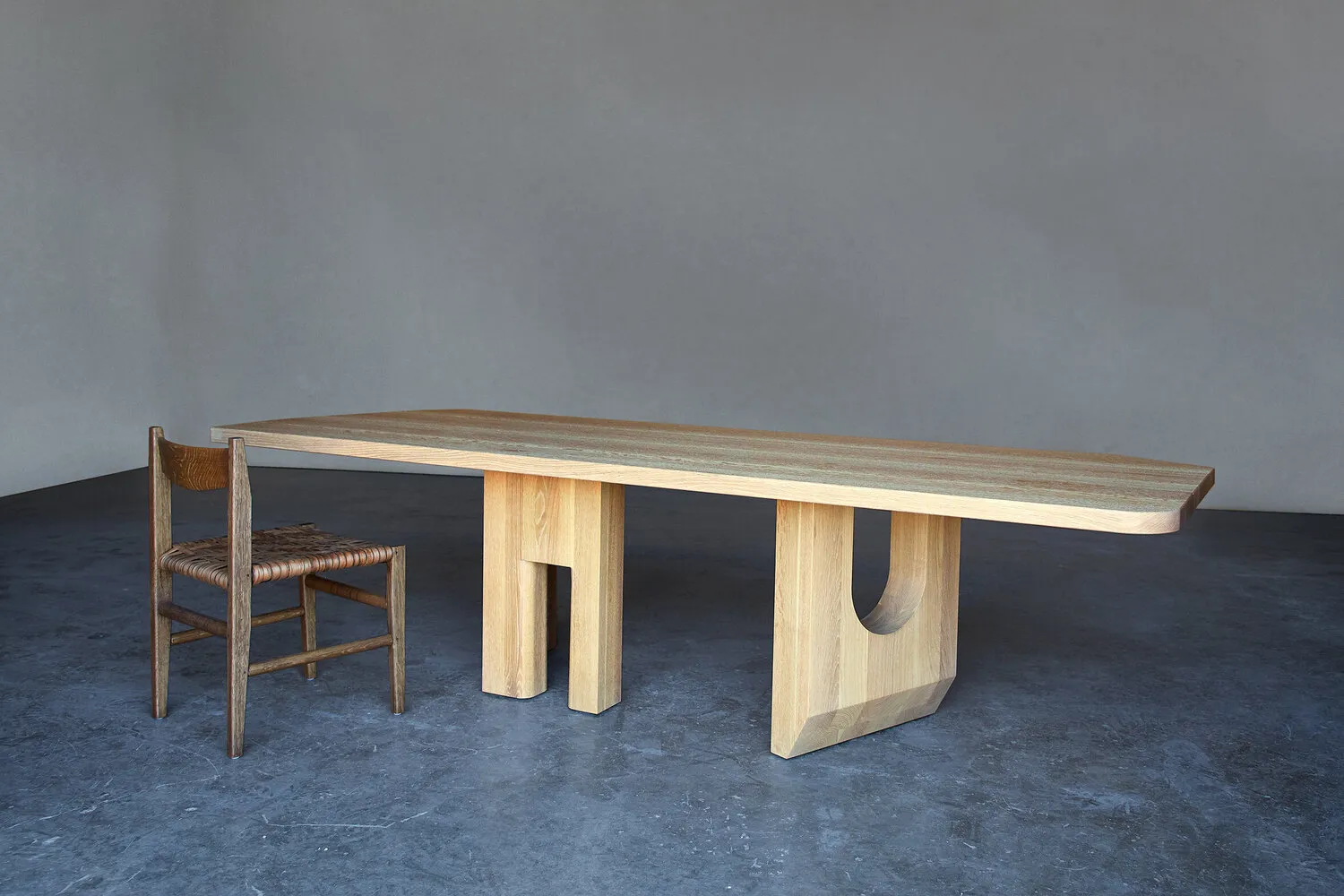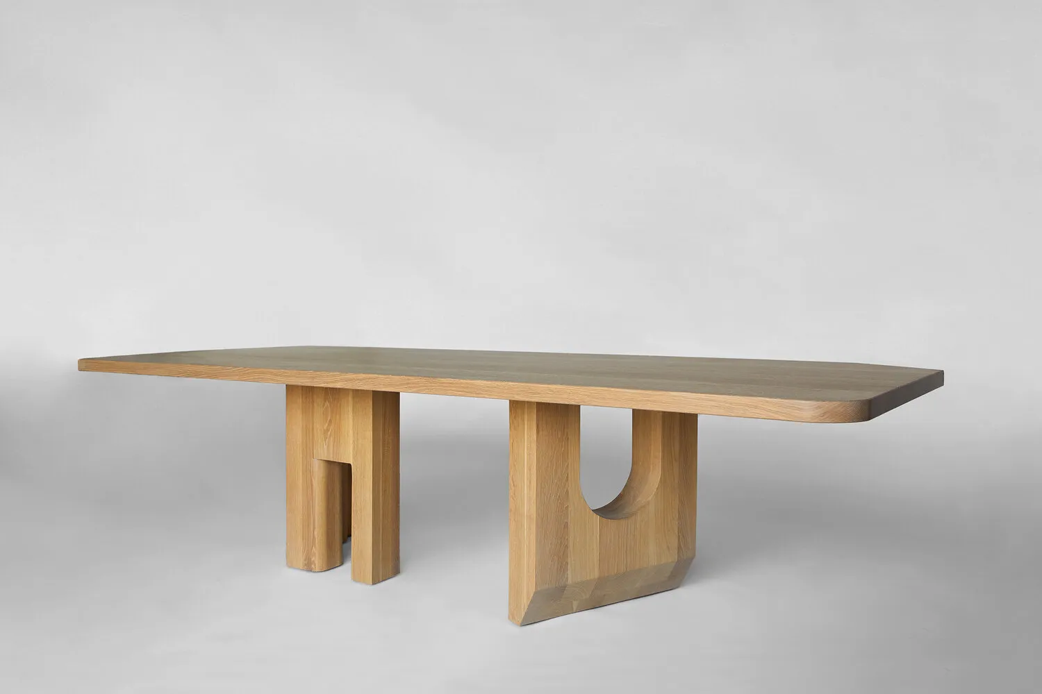 The Tulia Dining Table features a solid wood top in a variety of shapes with solid laminated wood base elements.