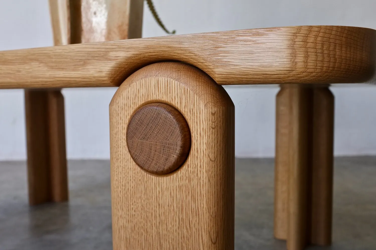 A softened solid wood table top keyways into arched leg structures, harmonizing with a circular end grain feature. Available in Round, Square or Rectangular formats.