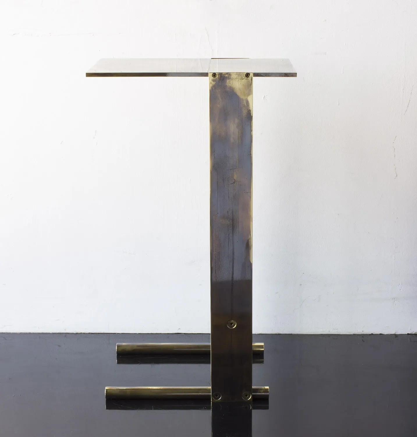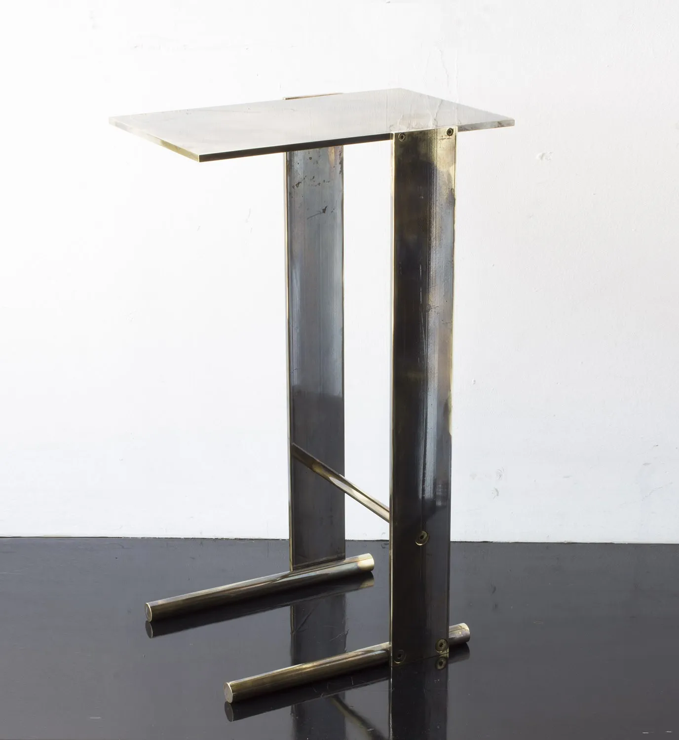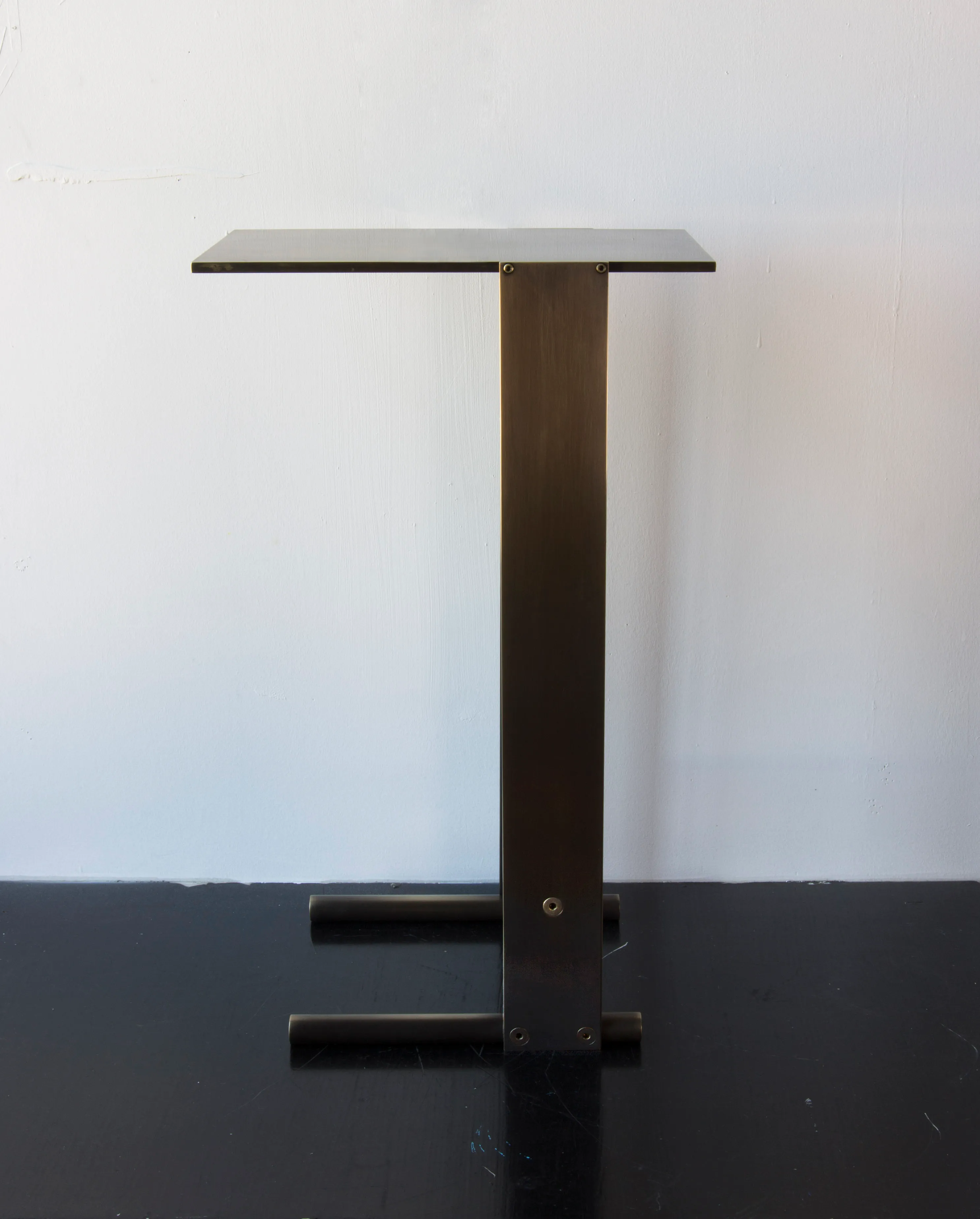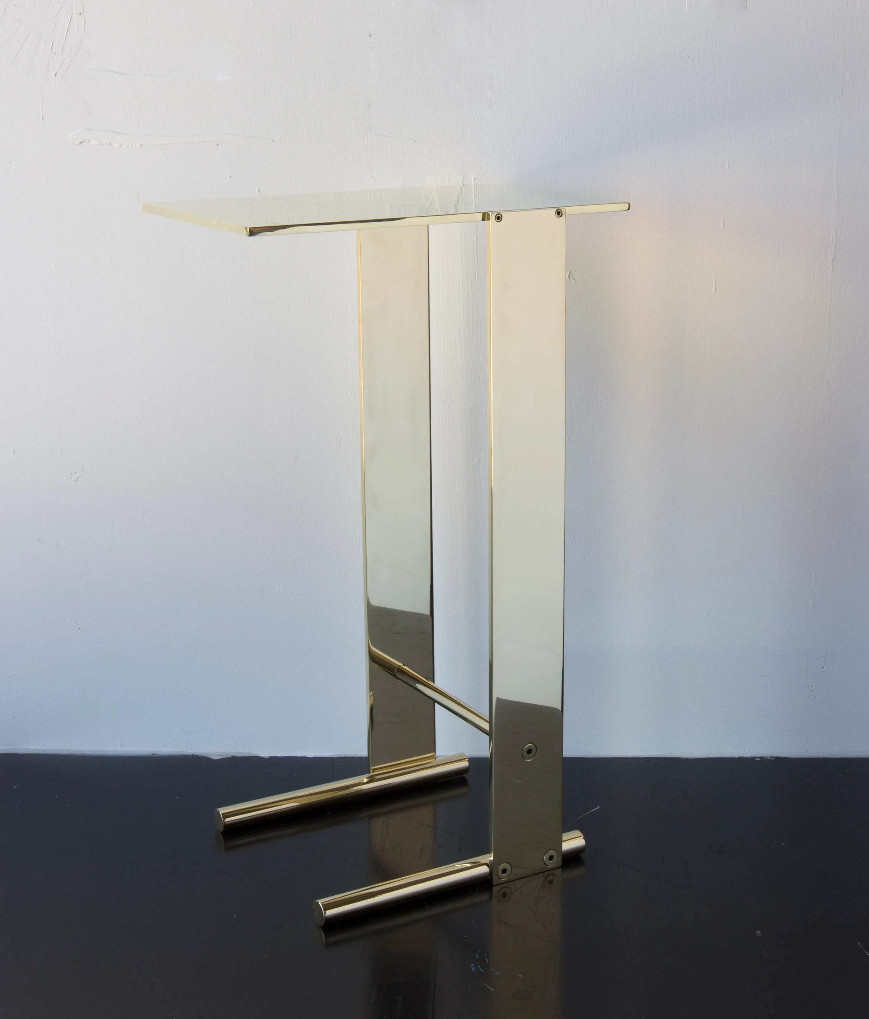 Solid machined brass with recessed hex-head fasteners. Rectangular cantilever design is a play on connections and lightness in a solid metallic form. Petite sized to pull up next to a sofa or reading chair; well suited as a drink tray or book stand.