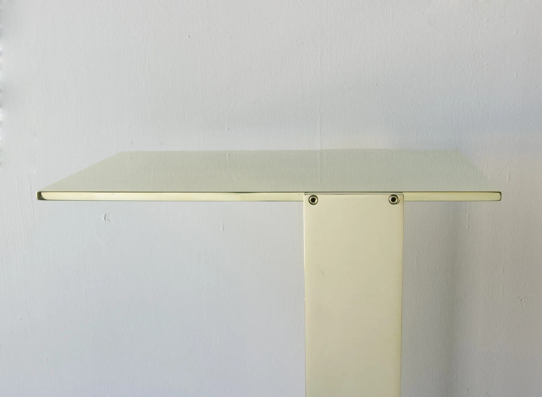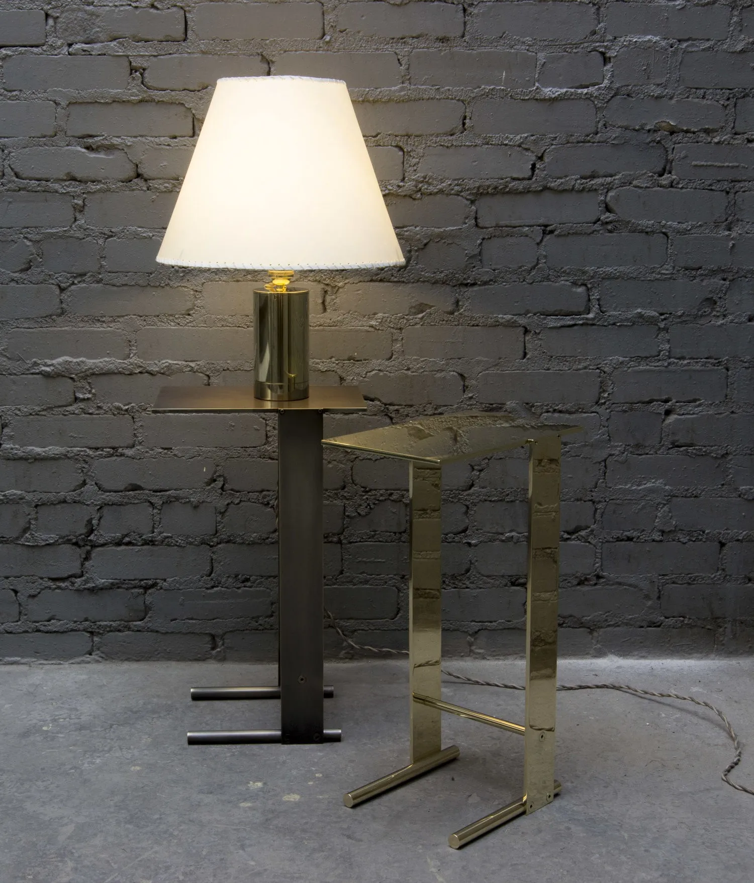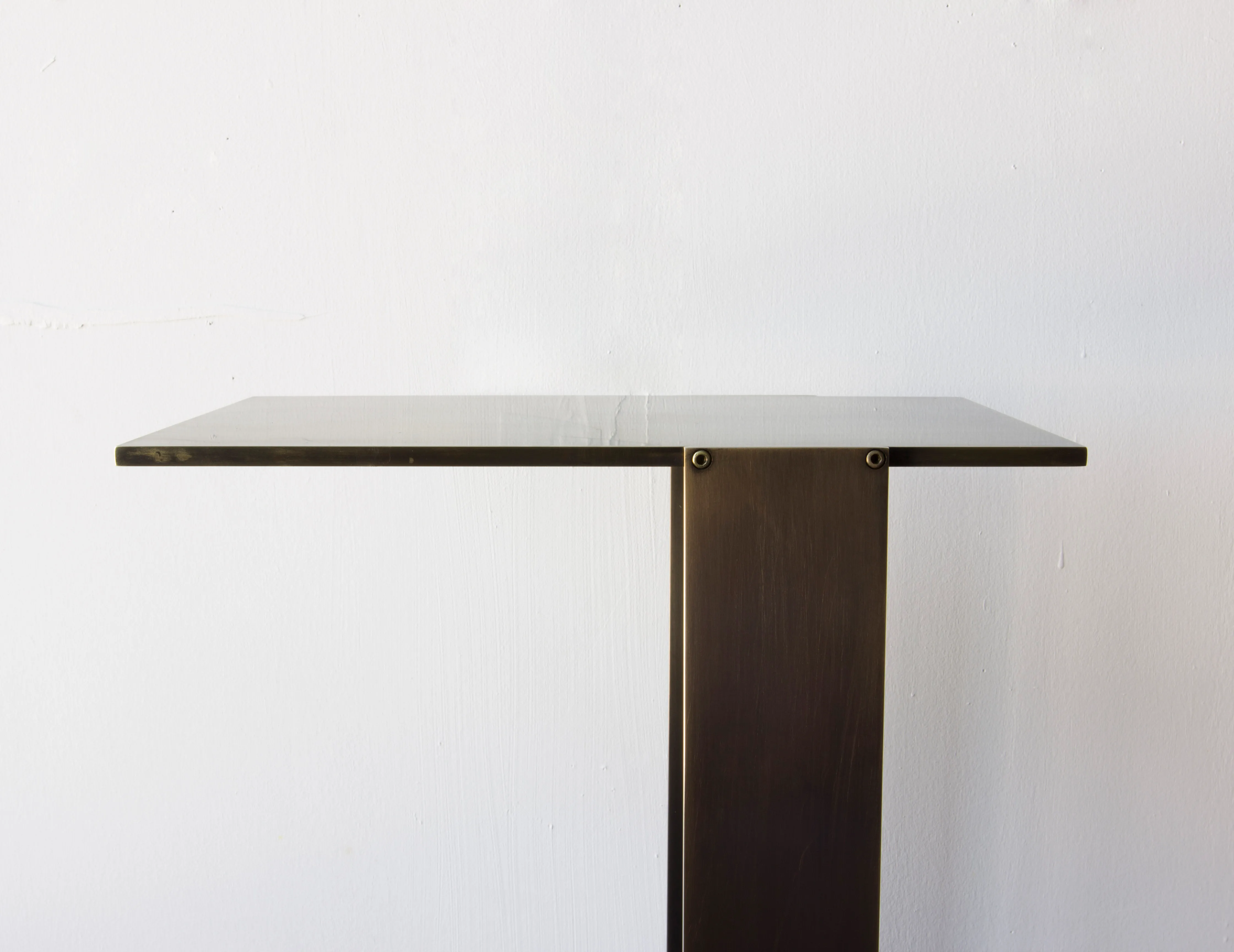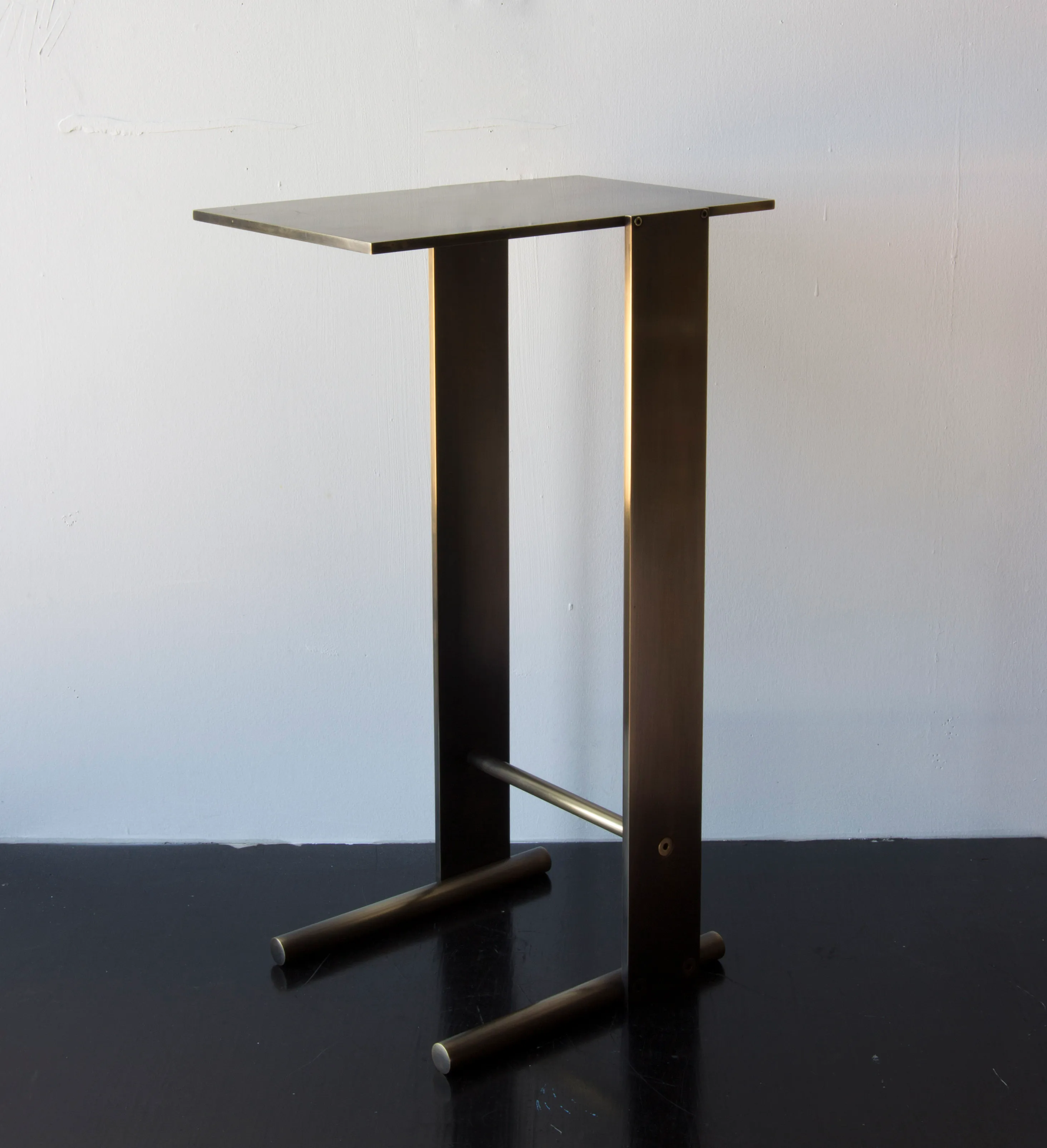 Solid machined brass with recessed hex-head fasteners. Rectangular cantilever design is a play on connections and lightness in a solid metallic form. Petite sized to pull up next to a sofa or reading chair; well suited as a drink tray or book stand.