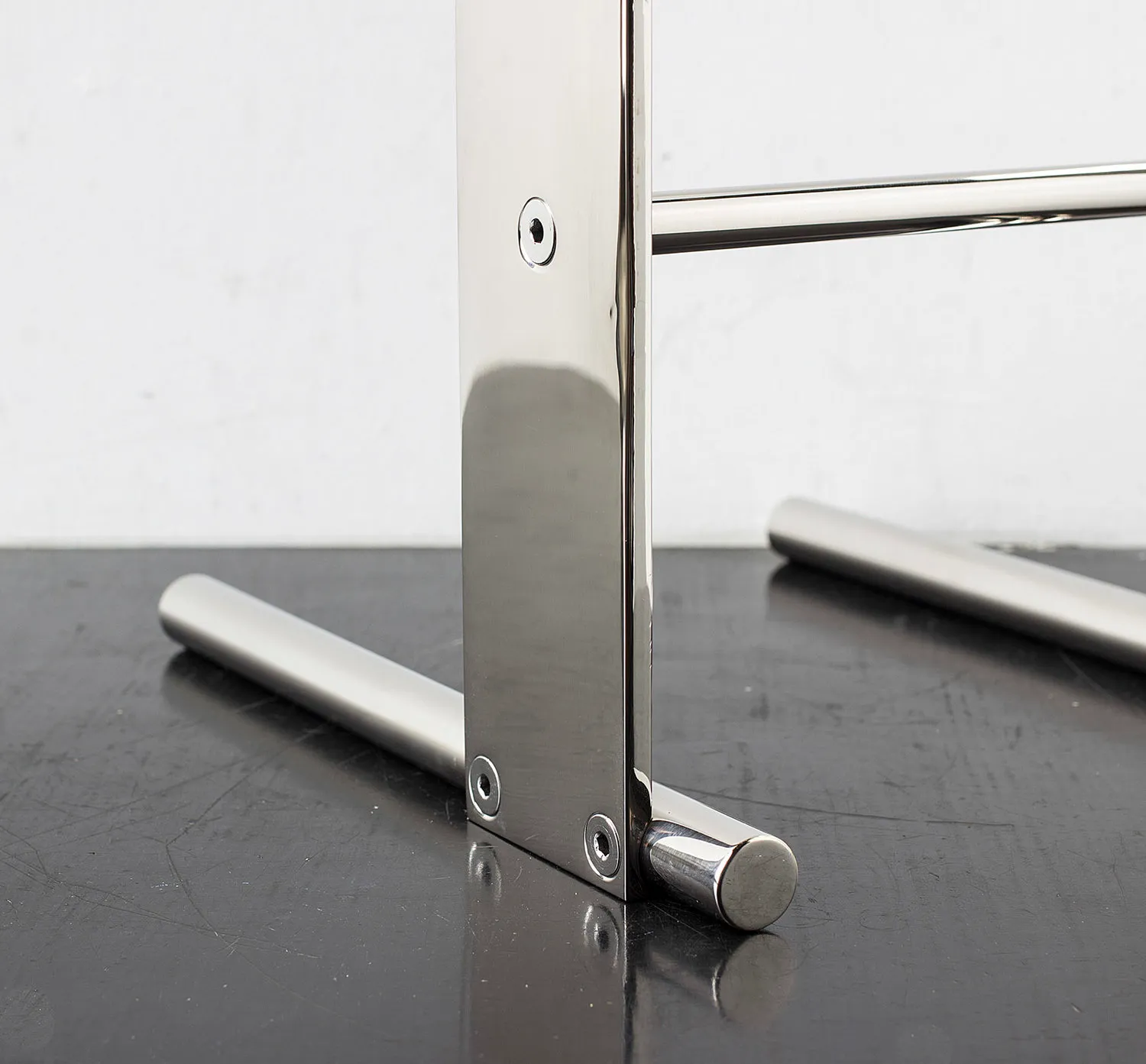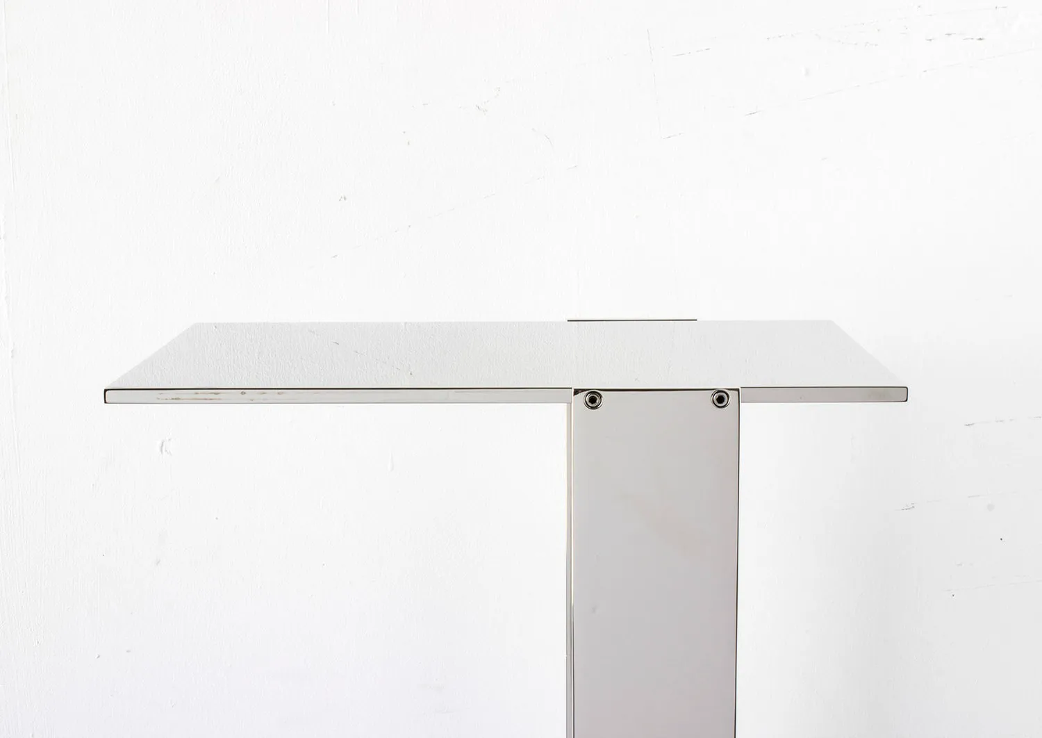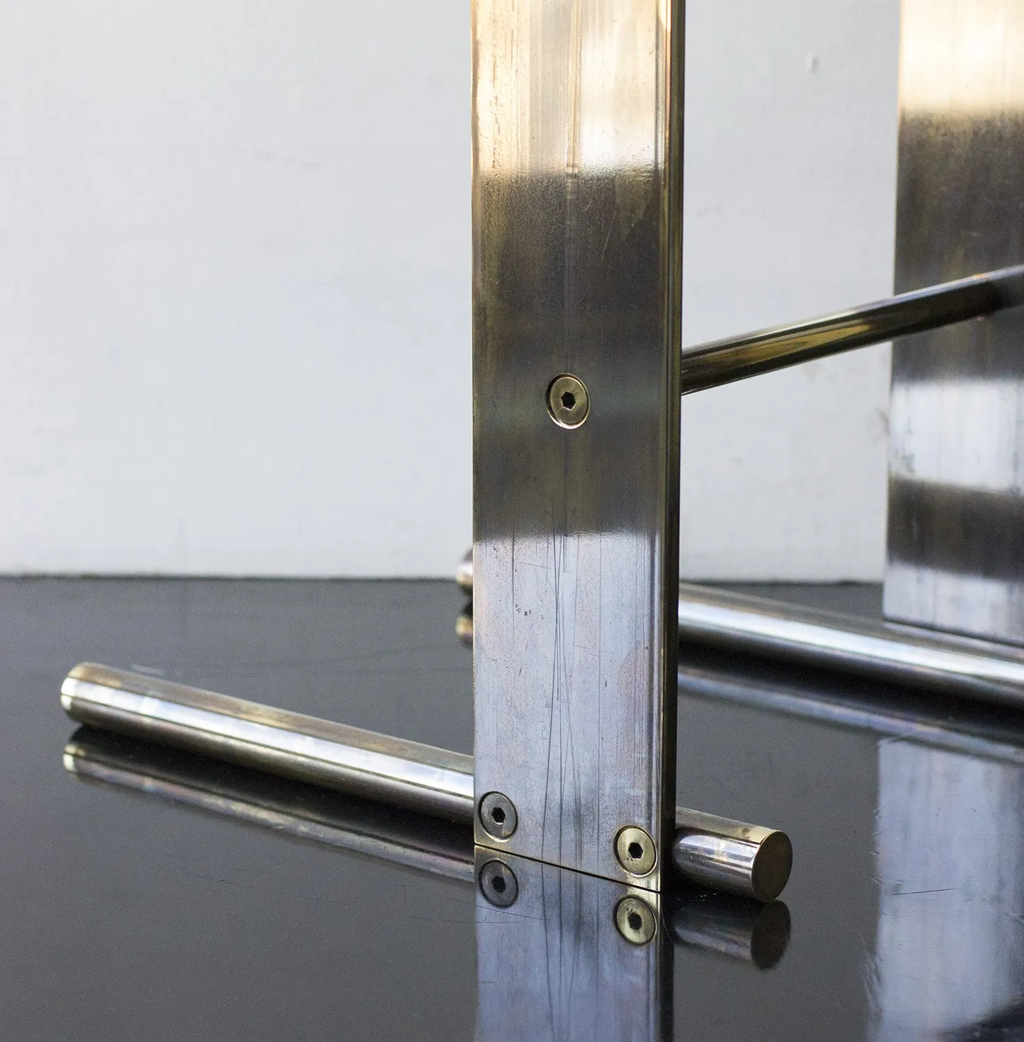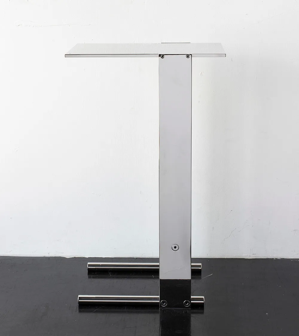 Solid machined brass with recessed hex-head fasteners. Rectangular cantilever design is a play on connections and lightness in a solid metallic form. Petite sized to pull up next to a sofa or reading chair; well suited as a drink tray or book stand.