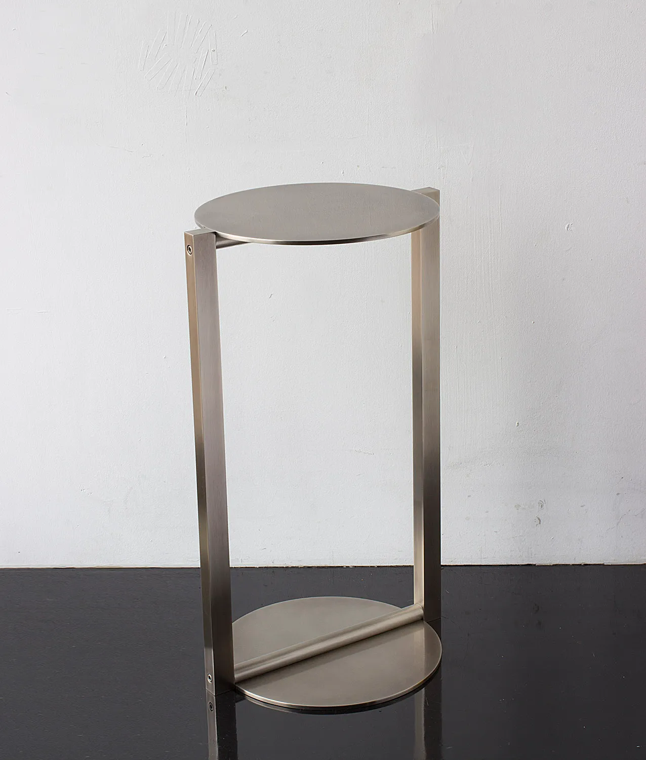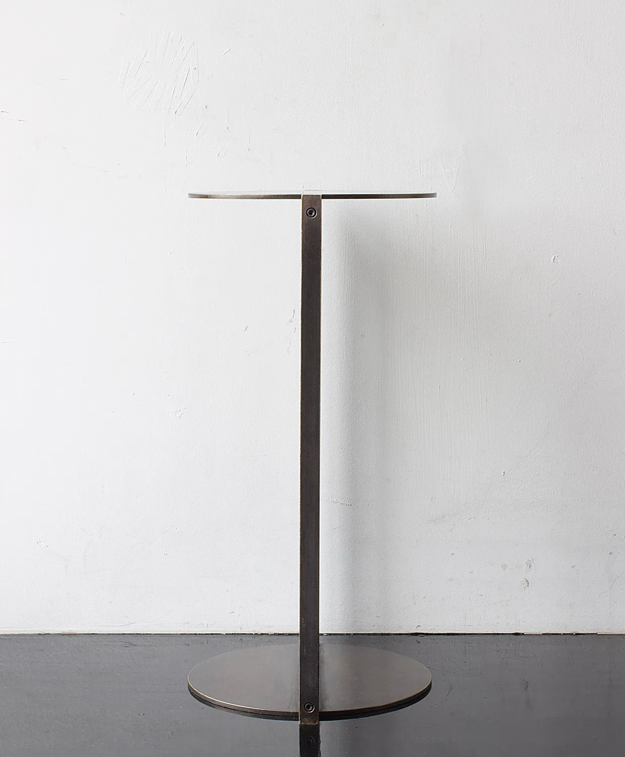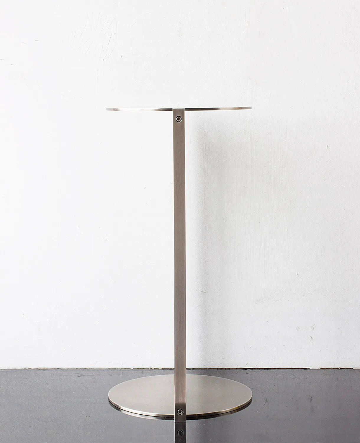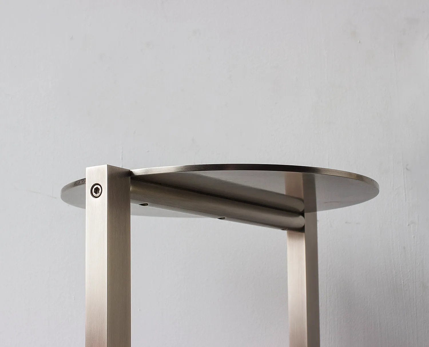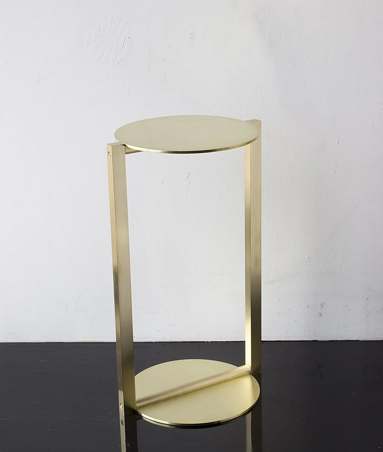 Solid machined brass with recessed hex-head fasteners. The suspended lever design is a play on lightness and visual illusion in a solid metallic form. Petite sized to pull up next to a sofa or reading chair; well suited as a drink tray or book stand.