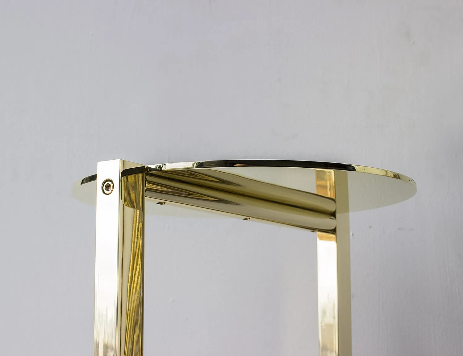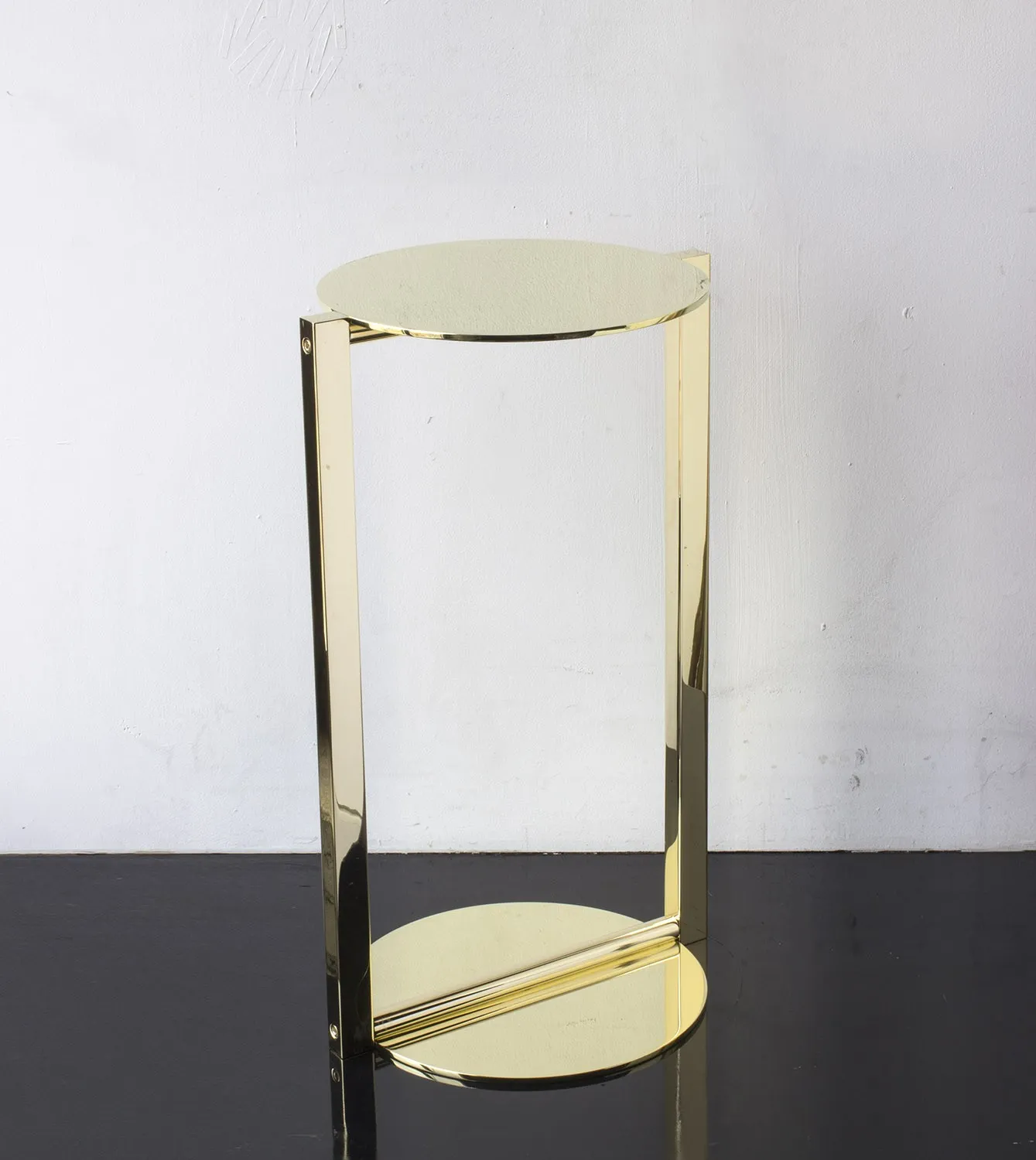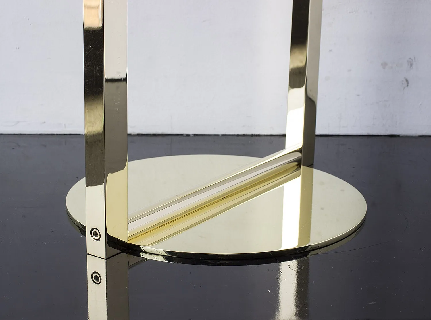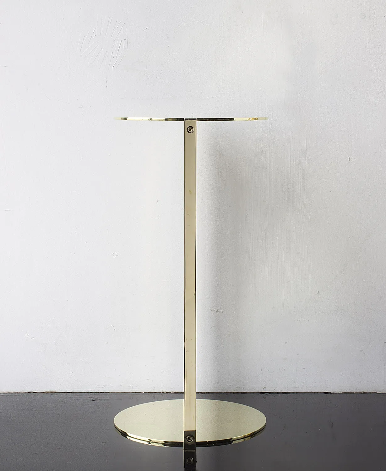 Solid machined brass with recessed hex-head fasteners. The suspended lever design is a play on lightness and visual illusion in a solid metallic form. Petite sized to pull up next to a sofa or reading chair; well suited as a drink tray or book stand.