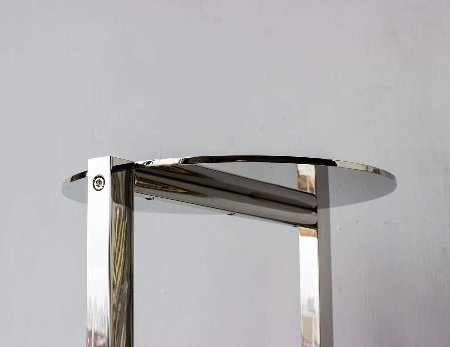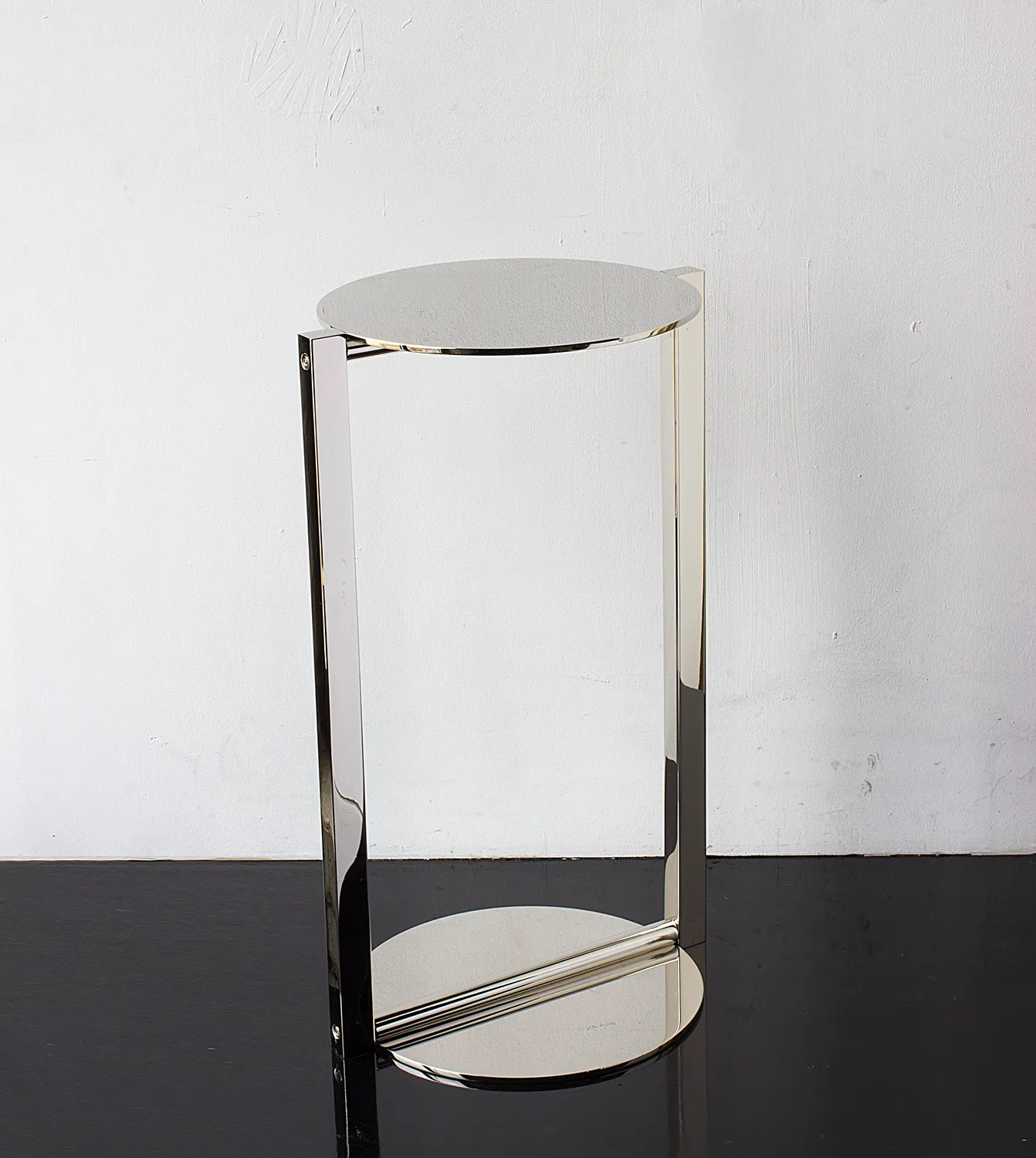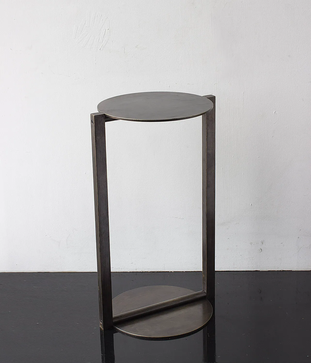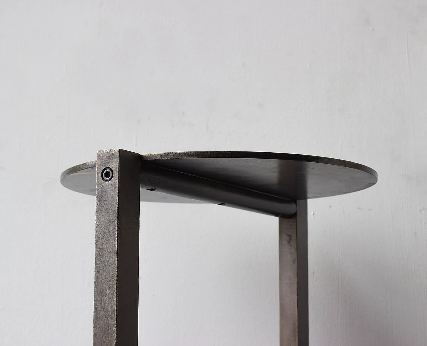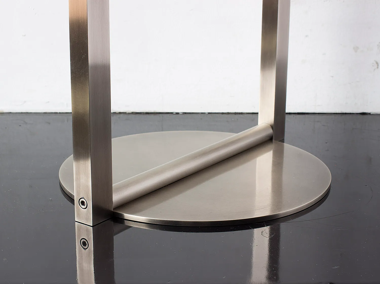 Solid machined brass with recessed hex-head fasteners. The suspended lever design is a play on lightness and visual illusion in a solid metallic form. Petite sized to pull up next to a sofa or reading chair; well suited as a drink tray or book stand.