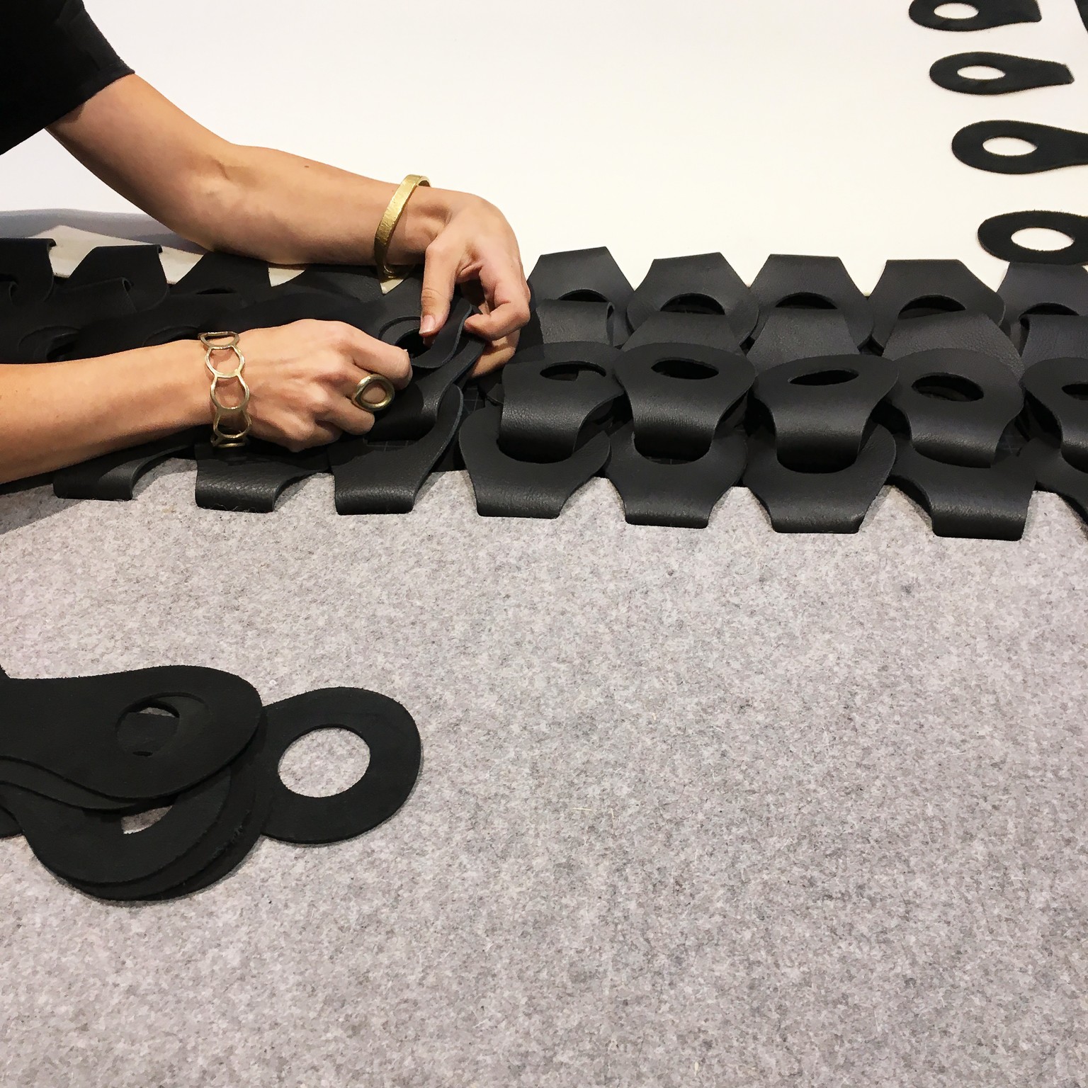 The Vertebrae Wall Tapestry is crafted in heavyweight wool felt with woven die-cut leather links. This organic artwork adorns the wall of any room.