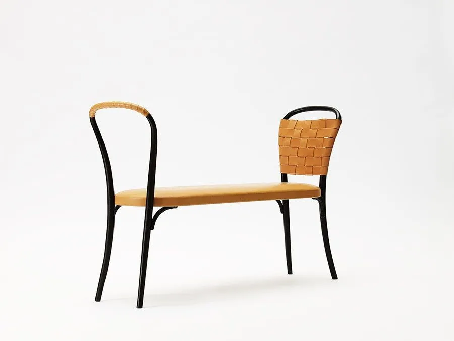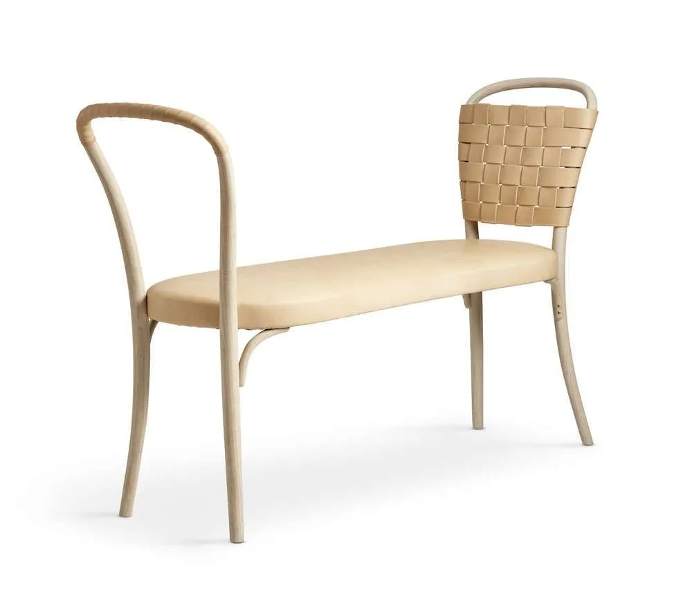 An elegant and sturdy bench in solid steambent beech or ash. A generous pad in vegetable tanned leather, upholstered with natural hairlok and wool. One leather swaddled backrest and one dressed in braided tooling leather. VILDA is offered in lacquered beech or oiled ash and with leather in various colors. The Bench is included in the VILDA family of 4 chairs and armchair.