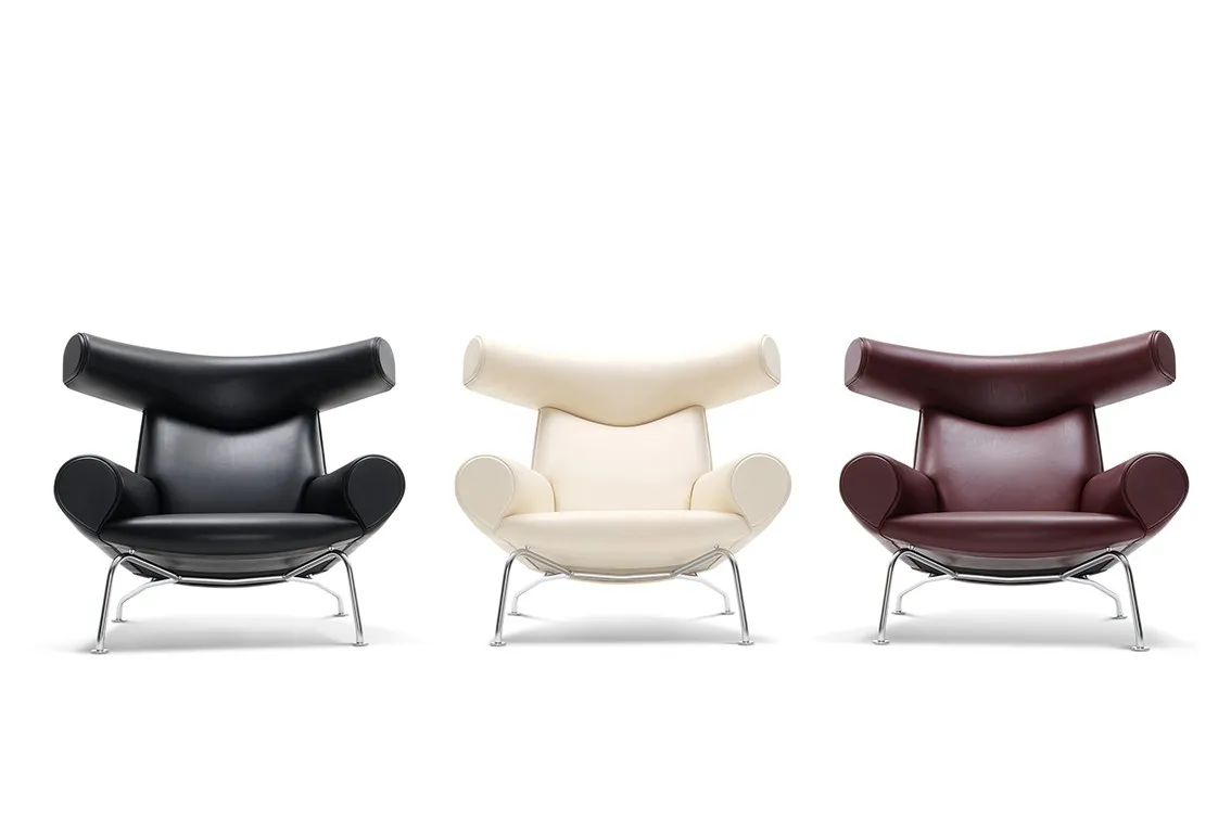 Designed by Hans J. Wegner, the Ox Chair is an iconic statement piece with an indisputable presence. A bold, sculptural chair that challenged the understated aesthetics of Danish design at the time, with its distinctive headrest referencing ox horns and its voluminous body. It demonstrates Wegner’s organic, artistic approach to furniture and desire to redefine traditional seating.