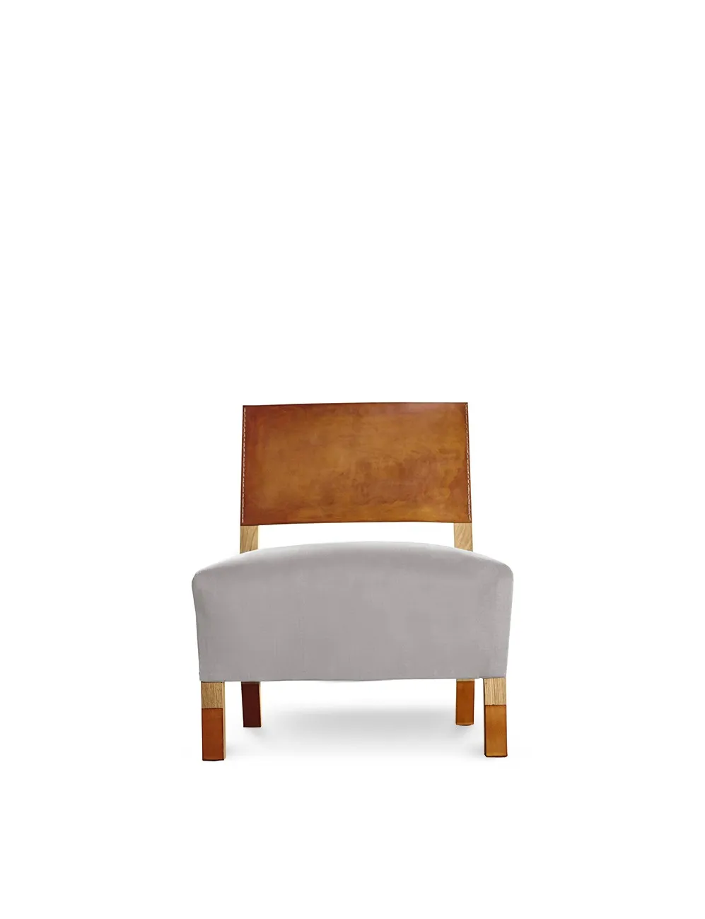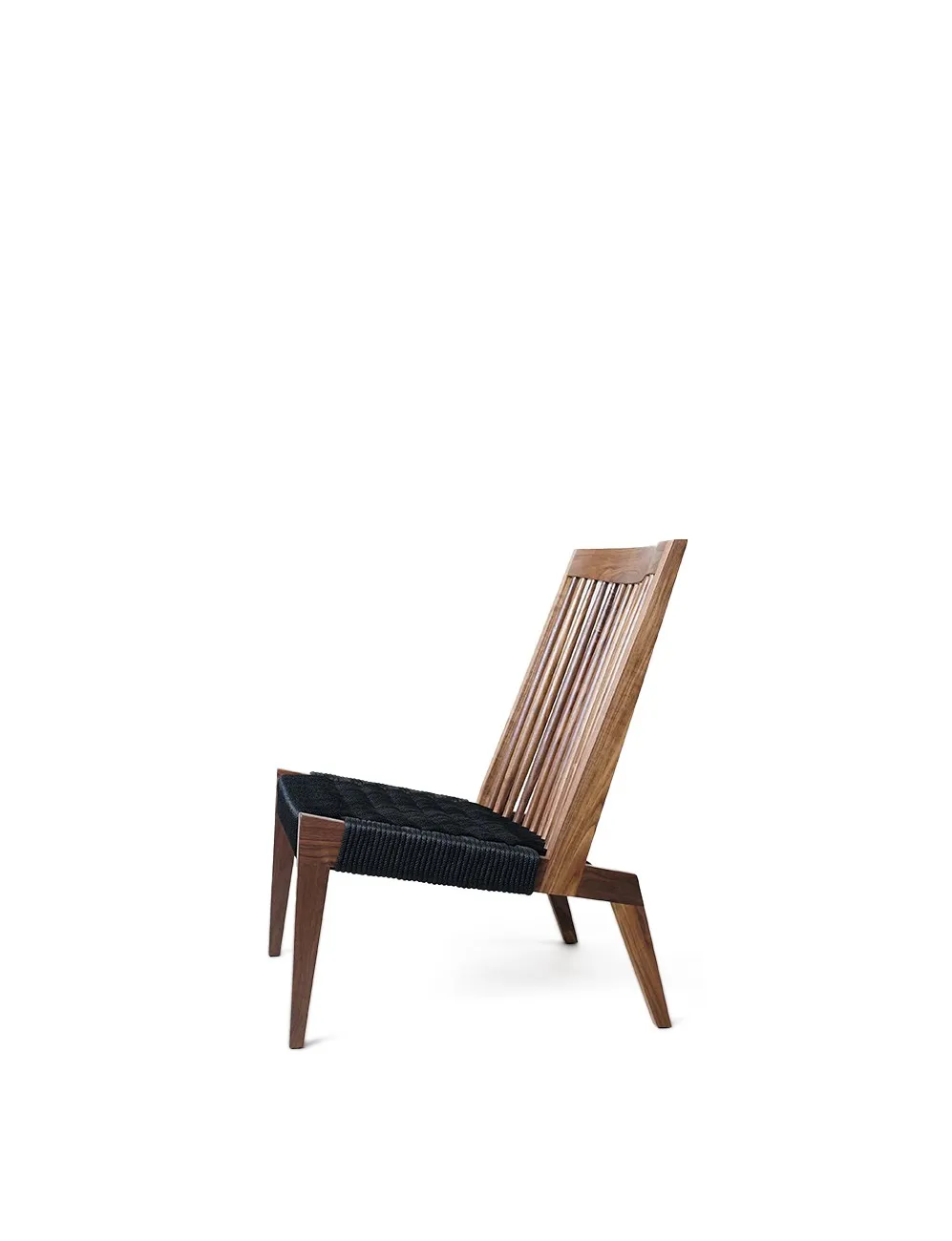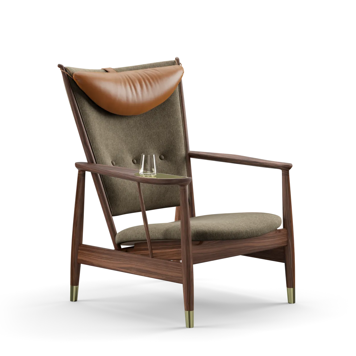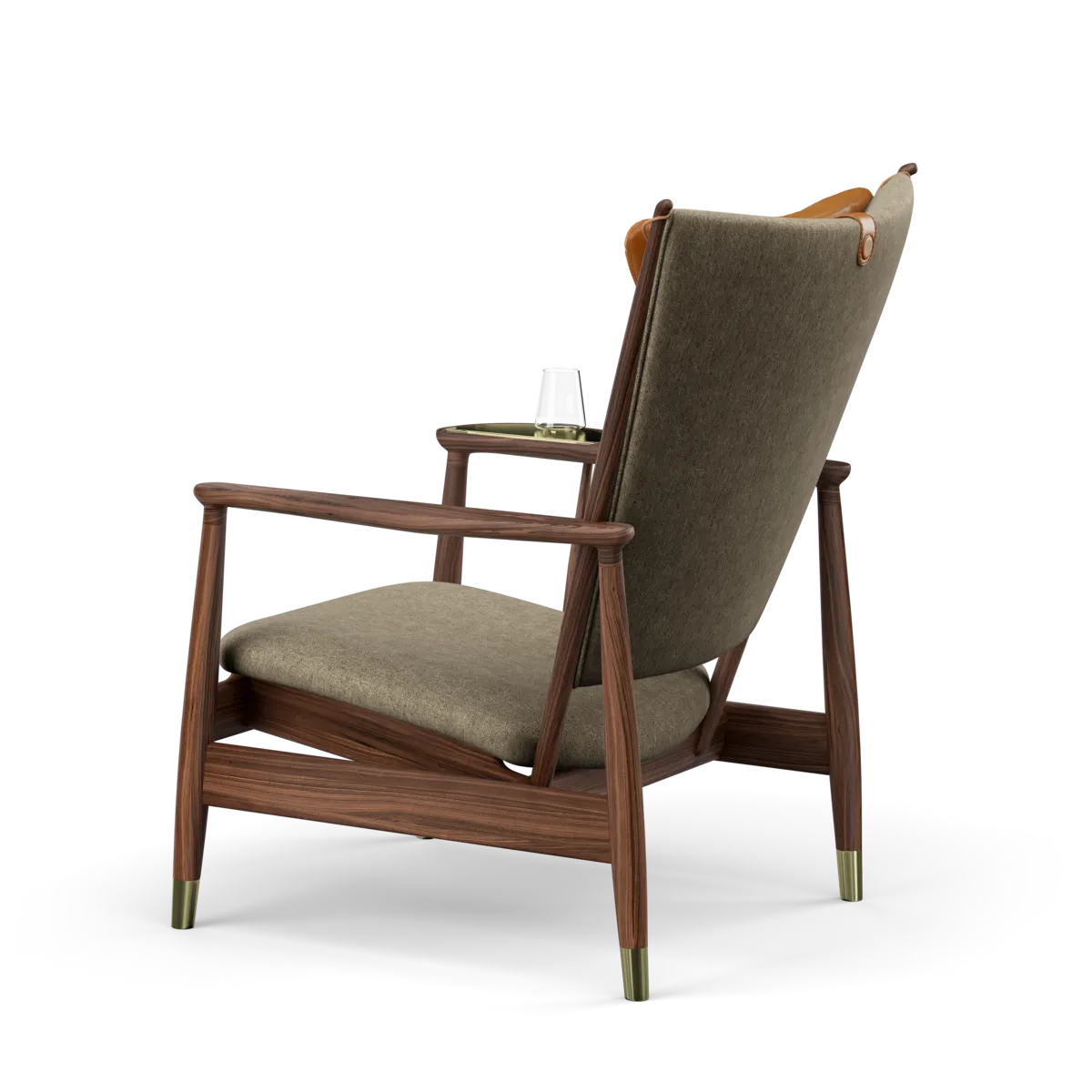 The Whisky Chair was designed by Finn Juhl in 1948 and is characterized by his artistic sense of shape, function, and detail. The chair is produced in American walnut and is upholstered by hand in leather and/or textile. Furthermore, the chair is crafted with a handmade brass tray and characteristic brass feet. Upon purchase, customers will receive a unique mouth-blown glass crafted by glassmaker Mikkel Yerst.