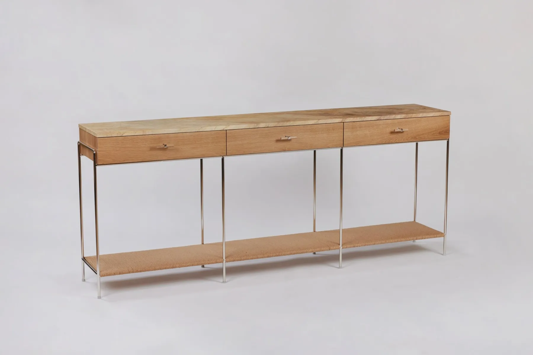 White Oak Console with marble top and rush shelf - Polished Nickel Plated