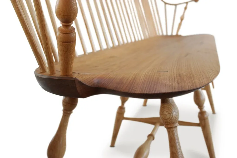 All of our Arm Chairs can be built as Settees. Shown here is the Continuous Arm Settee. Designed by David Sawyer, the Continuous Arm Settee is based in the traditional American Windsor style. It features a hand-carved seat, riven back and wedged joinery for maximum durability and comfort.