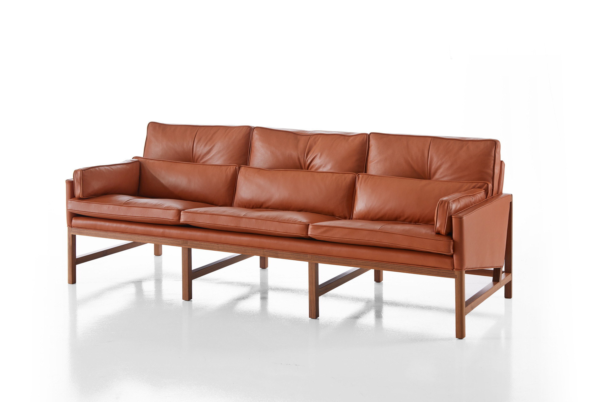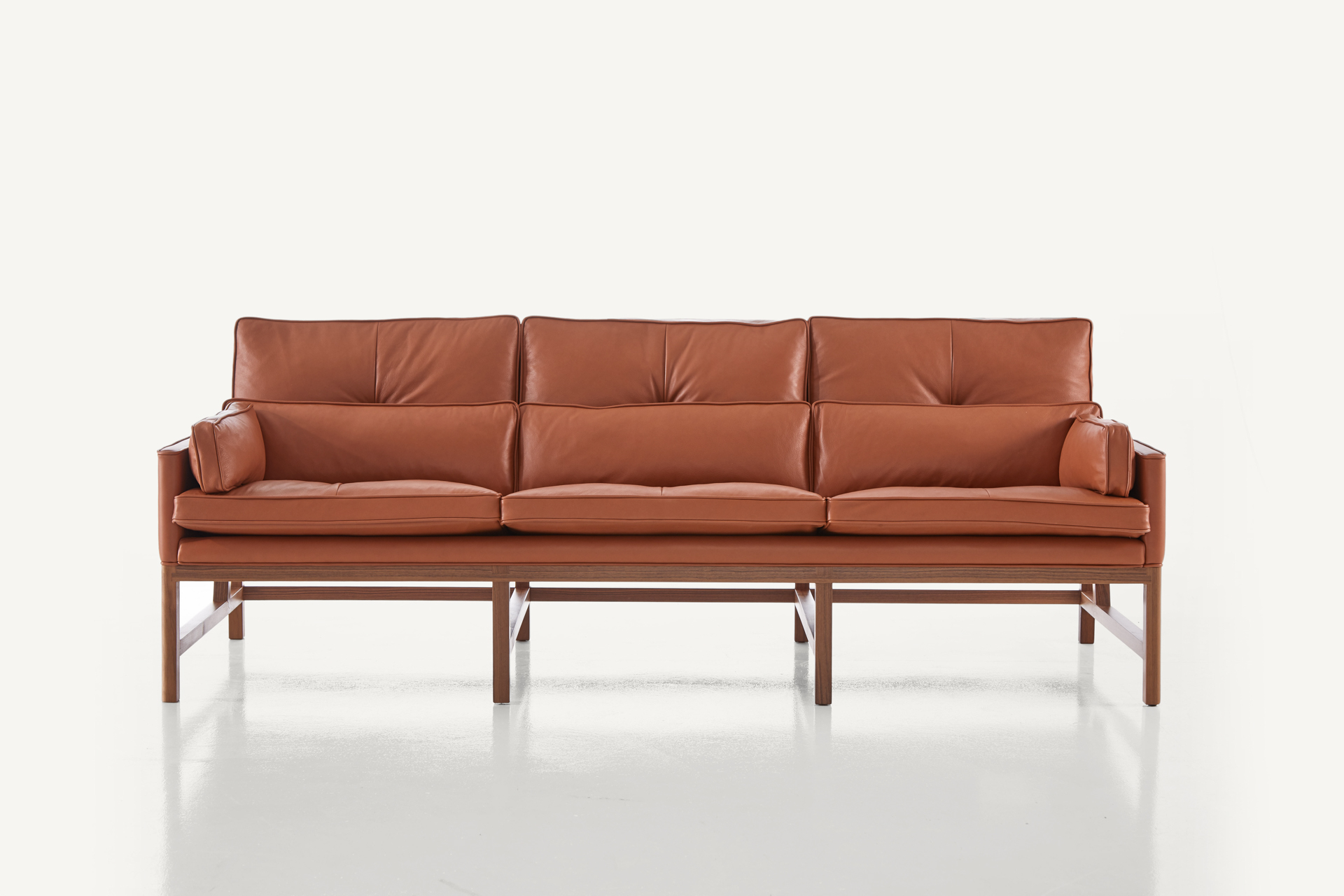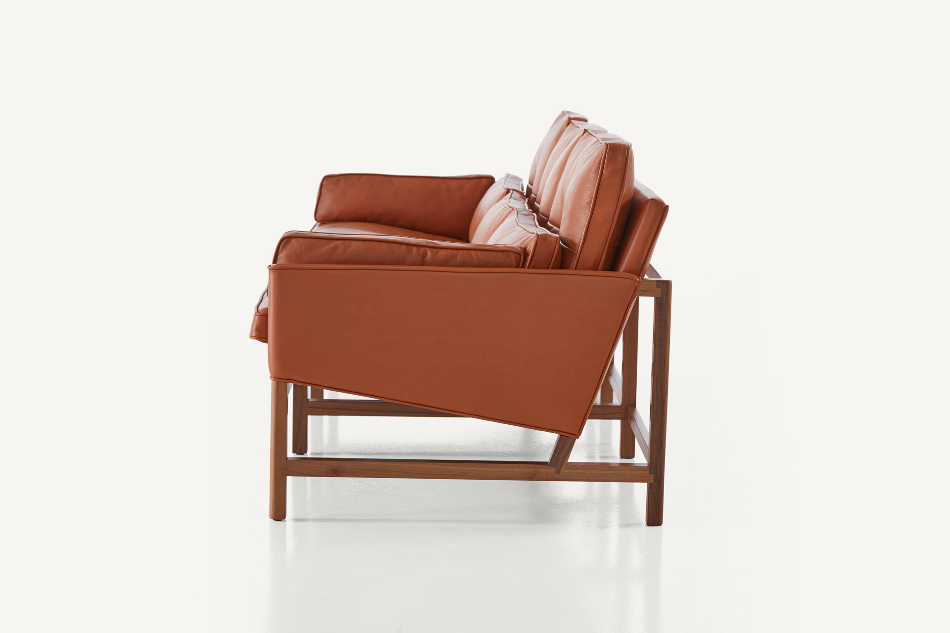 The signature elements of the BassamFellows aesthetic make up this expanded collection, originally conceived as a series of lounge pieces. The Wood Frame Collection is inspired by the glass house nature of our residence in Connecticut; we wanted to create furniture that looked immaculate, surveyed from every angle. The Wood Frame Lounge Chair deconstructs the bulkiness of traditional lounge seating, reducing it to its essence — an exposed structural wood frame, elevated to fine cabinetry as a Modernist grid, and a system of thin, layered cushions for total comfort. Available as low back and high back, as well as a reinterpretation of a classic wing back, each comes in club chair, settee, and sofa versions. In each instance the seating element is angled for ergonomic balance for an immediately settled, comfortable physical posture. Seat and back cushions comprised of a variable-density foam core are surrounded by plush down and feather pillows, with matching removable lumbar and bolster cushions. Upholstery options include a rich palette of natural grain leathers from Scandinavian hides as well as other fine contemporary textiles.