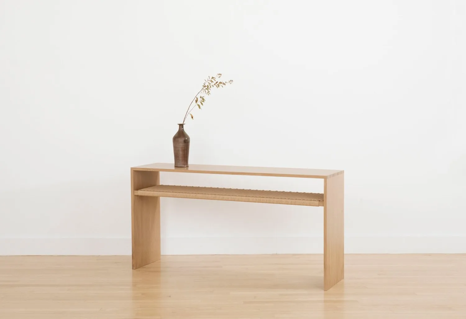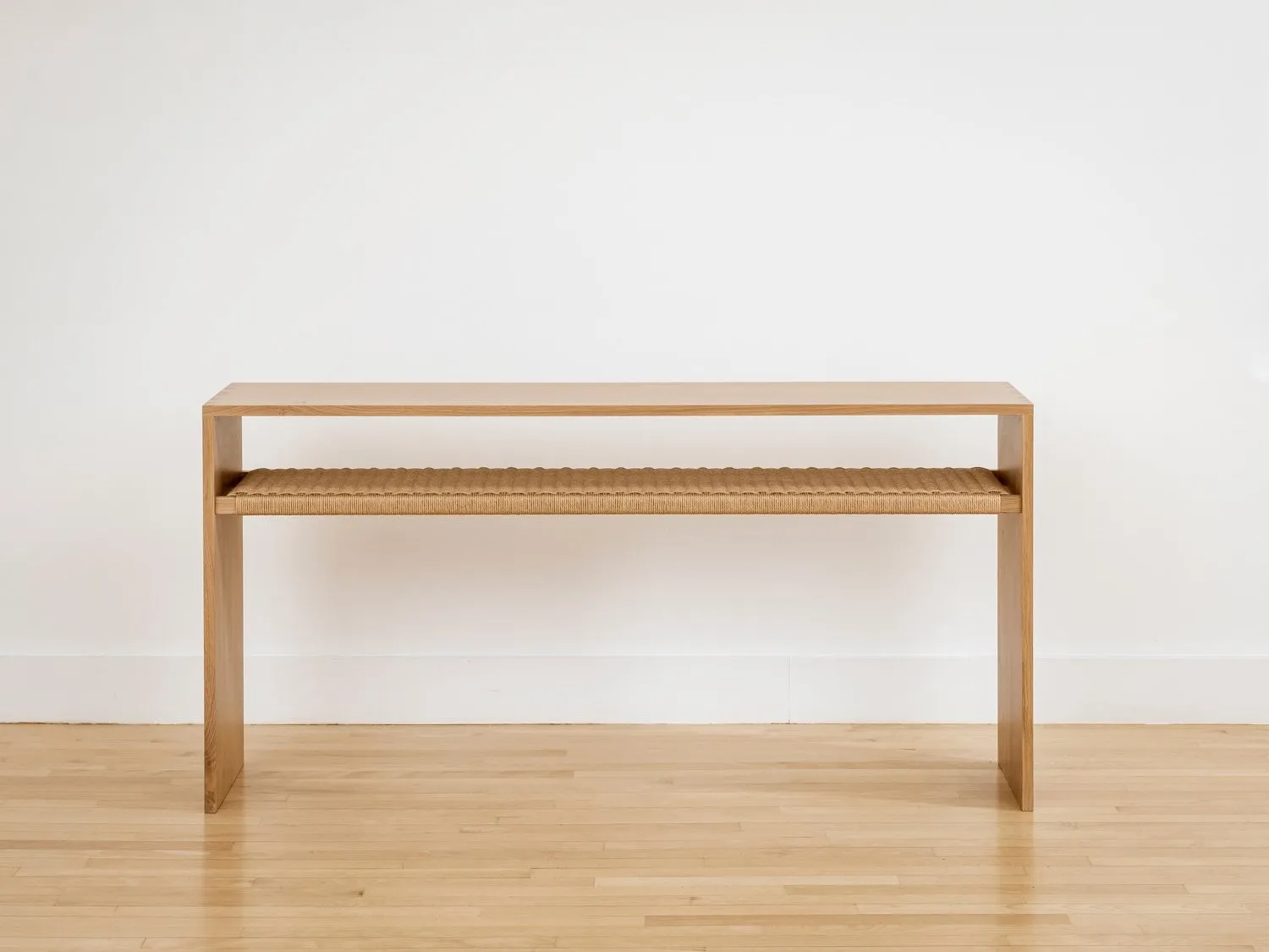 The Woven Console is constructed entirely of solid wood, and features offset finger joints and a woven Danish Cord shelf. A hand-applied oil finish highlights the natural color of the wood