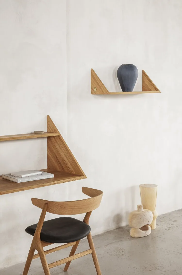 The underlying concept of XLIBRIS has been growing and developing in Kasper Eistrup’s mind for almost four years. It was originally stimulated by the artist’s own need for a workplace shelf in his atelier and subsequently by his aversion to shelf brackets. Initially as a personal project, Eistrup teamed up with Sibast Furniture to develop two pieces of multifunctional furniture: a wall-mounted, self-supporting shelf and a matching table, both with an ultra-slim silhouette and a light style, reminiscent of Japanese origami art – and completely devoid of brackets. Despite its apparent simplicity, XLIBRIS is brimming with small artisanal and functional details. These include a concealed cable outlet in the wall-mounted desk, enabling the elegant and discreet connection of a laptop, smartphone or lamp to the power grid. Both the shelf and the wall-mounted desk are assembled without visible screws, emphasising the impression of XLIBRIS as two integrated pieces of furniture that seemingly grow out of the wall.
