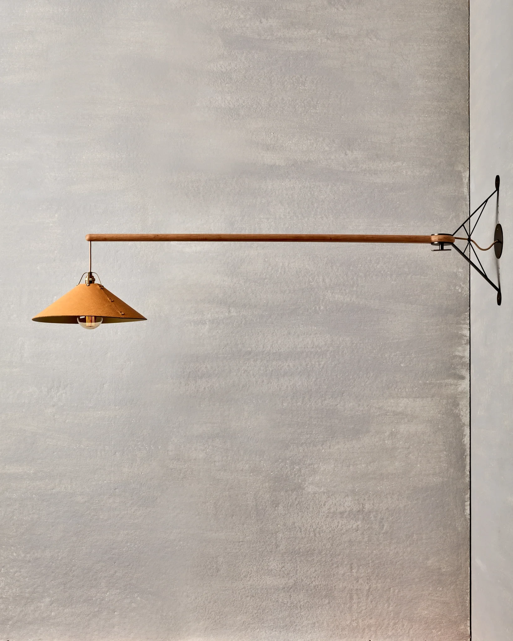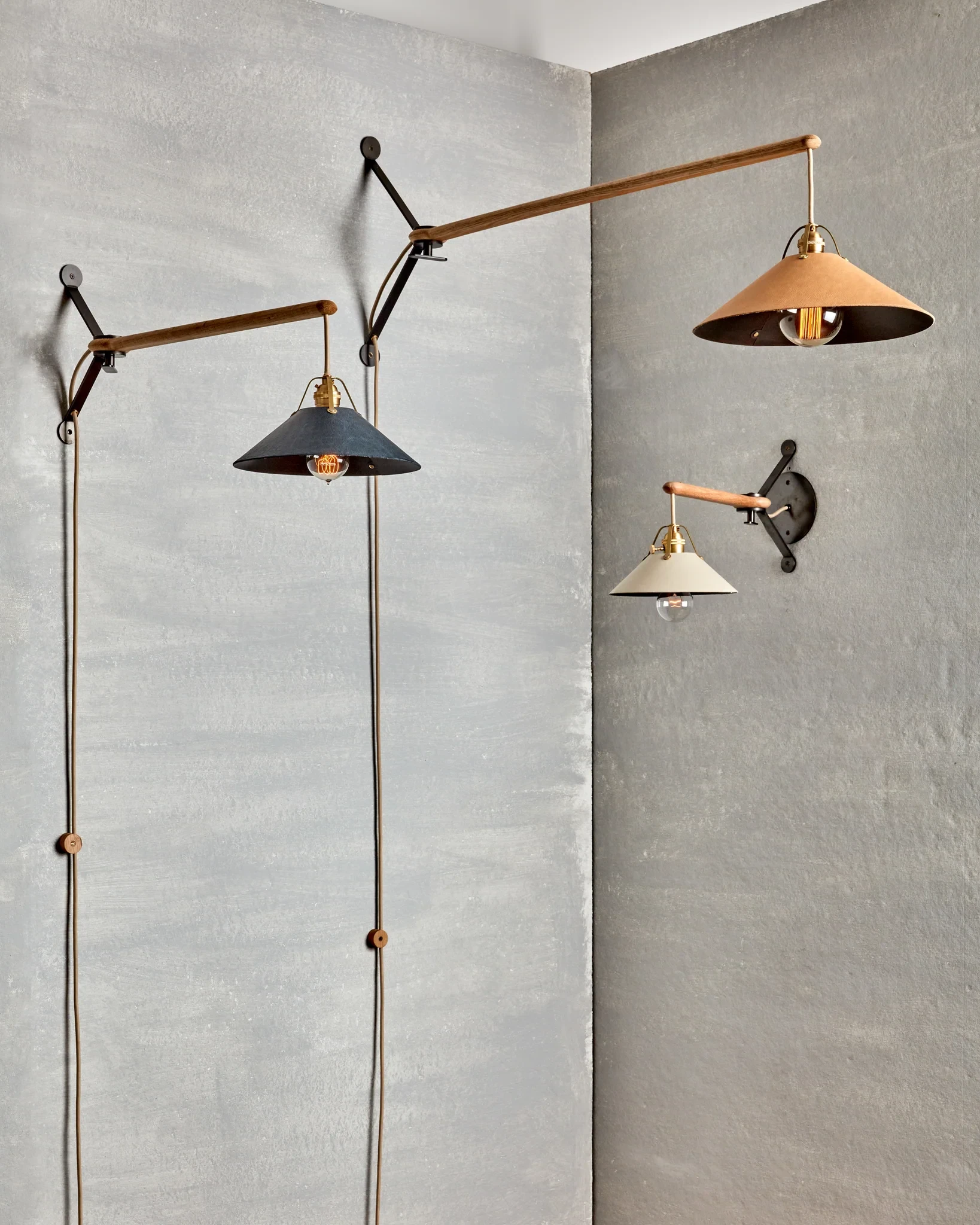 Our Yaffa Swing Arm Sconce is designed with a pivoting oak arm to illuminate 180 degrees with the assistance of its adjustable brass knob. The fixture is made of natural oak paired with oil-rubbed brass with a navy, natural or eggshell leather covered brass shade and is available in four sizes.